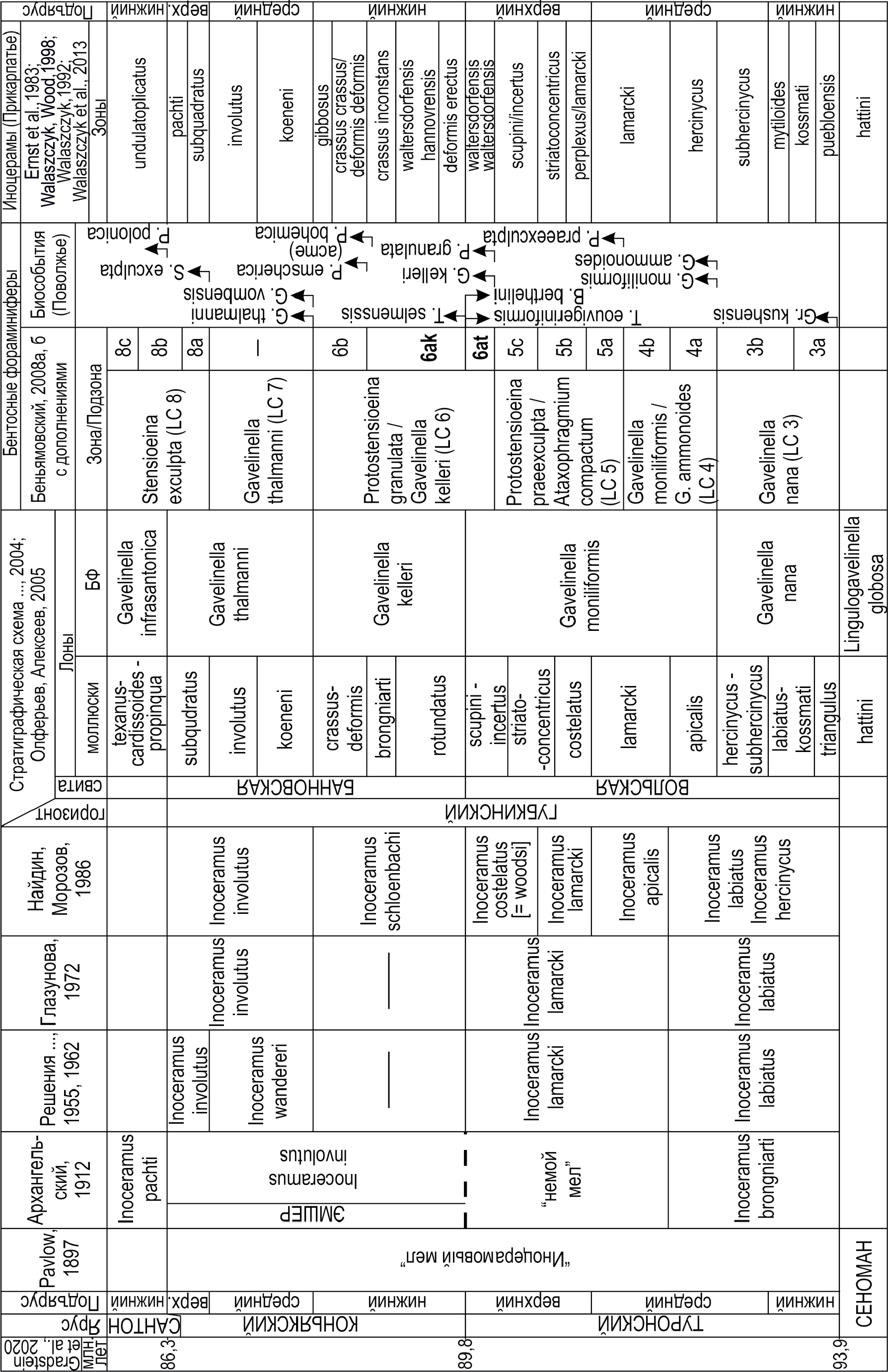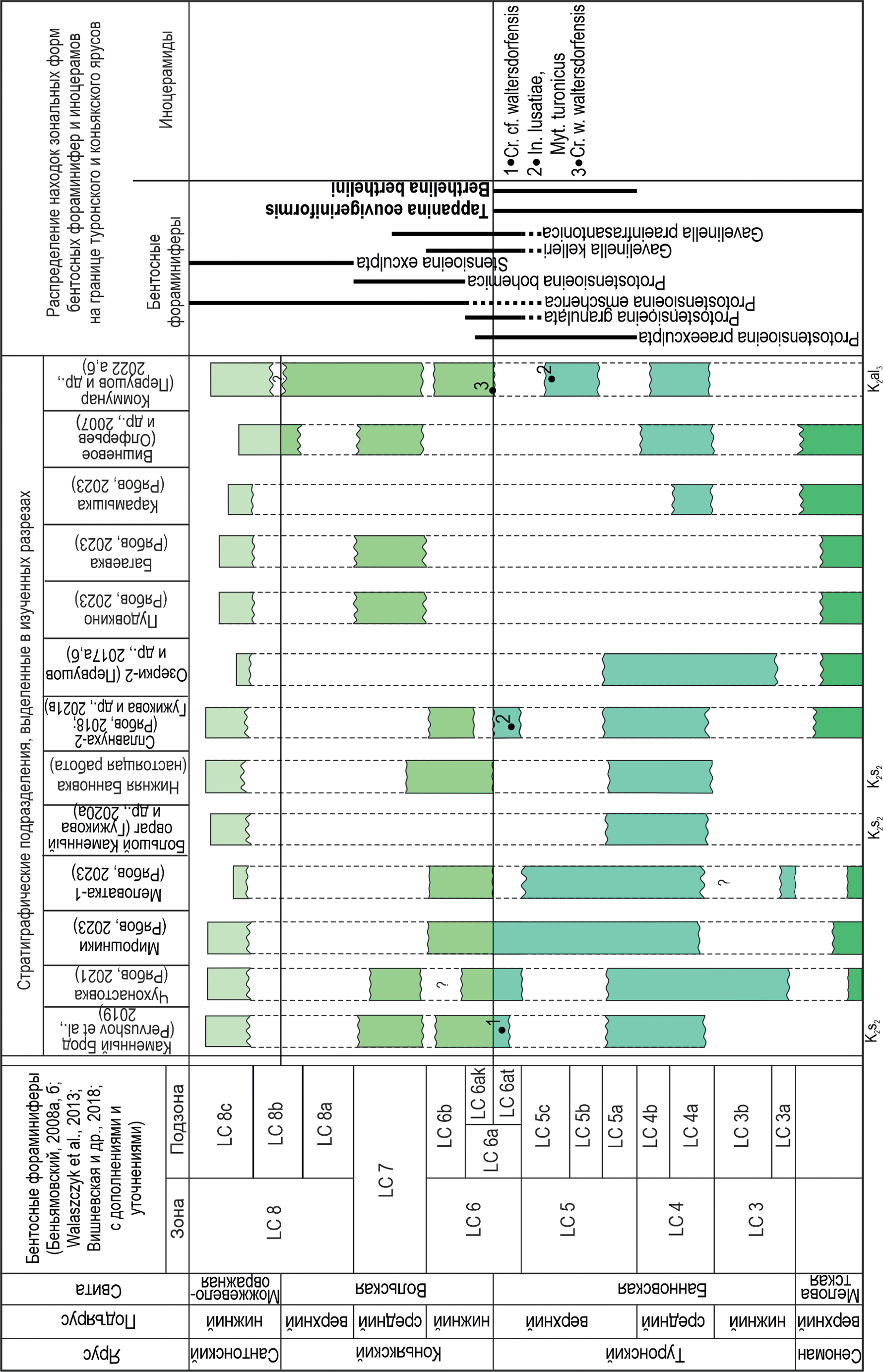 Поэтому можно считать, что положение нижней границы зоны LC6 не соответствует подошве коньякского яруса, а находится ниже. Тогда граница турона и коньяка внутри этой зоны требует дополнительного обоснования с использованием новых биостратиграфических критериев. В качестве таковых ранее были предложены уровень исчезновения типичных туронских видов Berthelina berthelini и Tappanina eouvigeriniformis и уровень появления вида Tappanina selmensis (Первушов и др., 2022а, 2022б, 2022в; Рябов, 2023). Эти биособытия прослеживаются во всех разрезах турона–коньяка Правобережного Поволжья, и для этого региона предложено выделять подзону Berthelina berthelini/Gavelinella kelleri LC6at (терминальный турон) и подзону Tappanina selmensis/Protostensioeina granulata LC6ak (нижний коньяк) (Первушов и др., 2022в; Рябов, 2023).