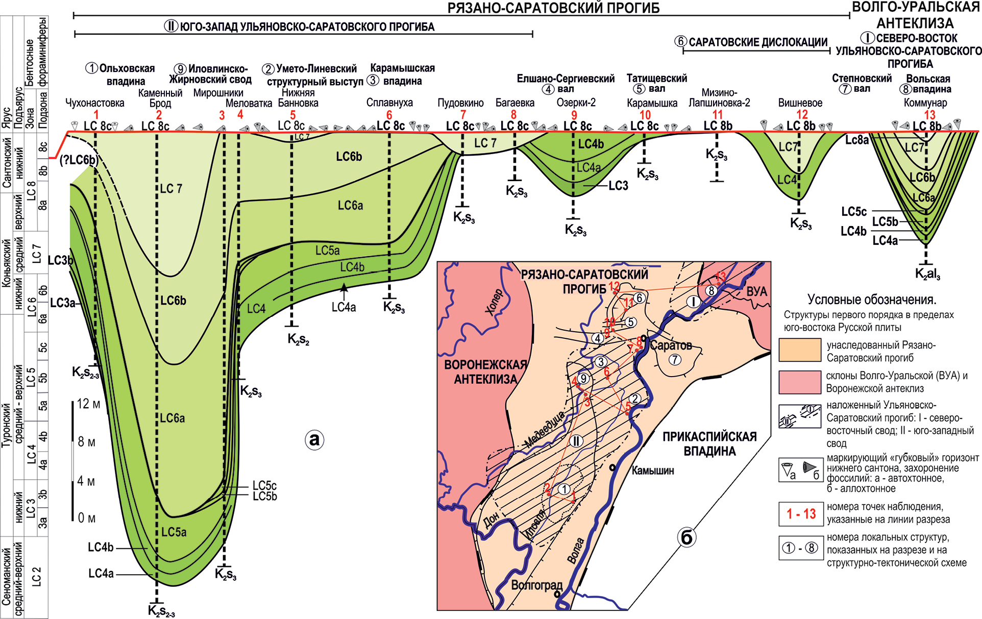 (а) — палеогеологический профиль по линии разрезов Чухонастовка–Каменный Брод–Мирошники–Меловатка–Нижняя Банновка–Сплавнуха–Пудовкино–Багаевка–Озерки-2–Карамышка–Мизино-Лапшиновка-2–Вишневое–Коммунар; (б) — положение линии палеогеологического профиля и ее соотношение с современным структурным планом территории. Ульяновско-Саратовский наложенный прогиб: I — северо-восточная часть, II — юго-западная часть; 1 — Ольховская впадина, 2 — Каменско-Золотовская структурная ступень, 3 — Карамышская впадина, 4 — Елшано-Сергеевский вал, 5 — Татищевский вал, 6 — Саратовские дислокации, 7 — Степновский вал, 8 — Вольская впадина, 9 — Терсинская впадина. ВУА — Волго-Уральская антеклиза