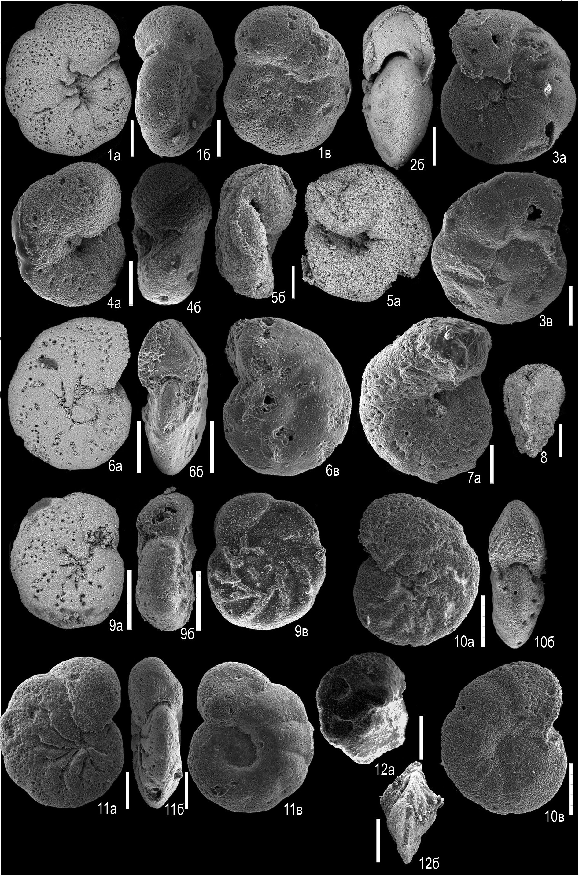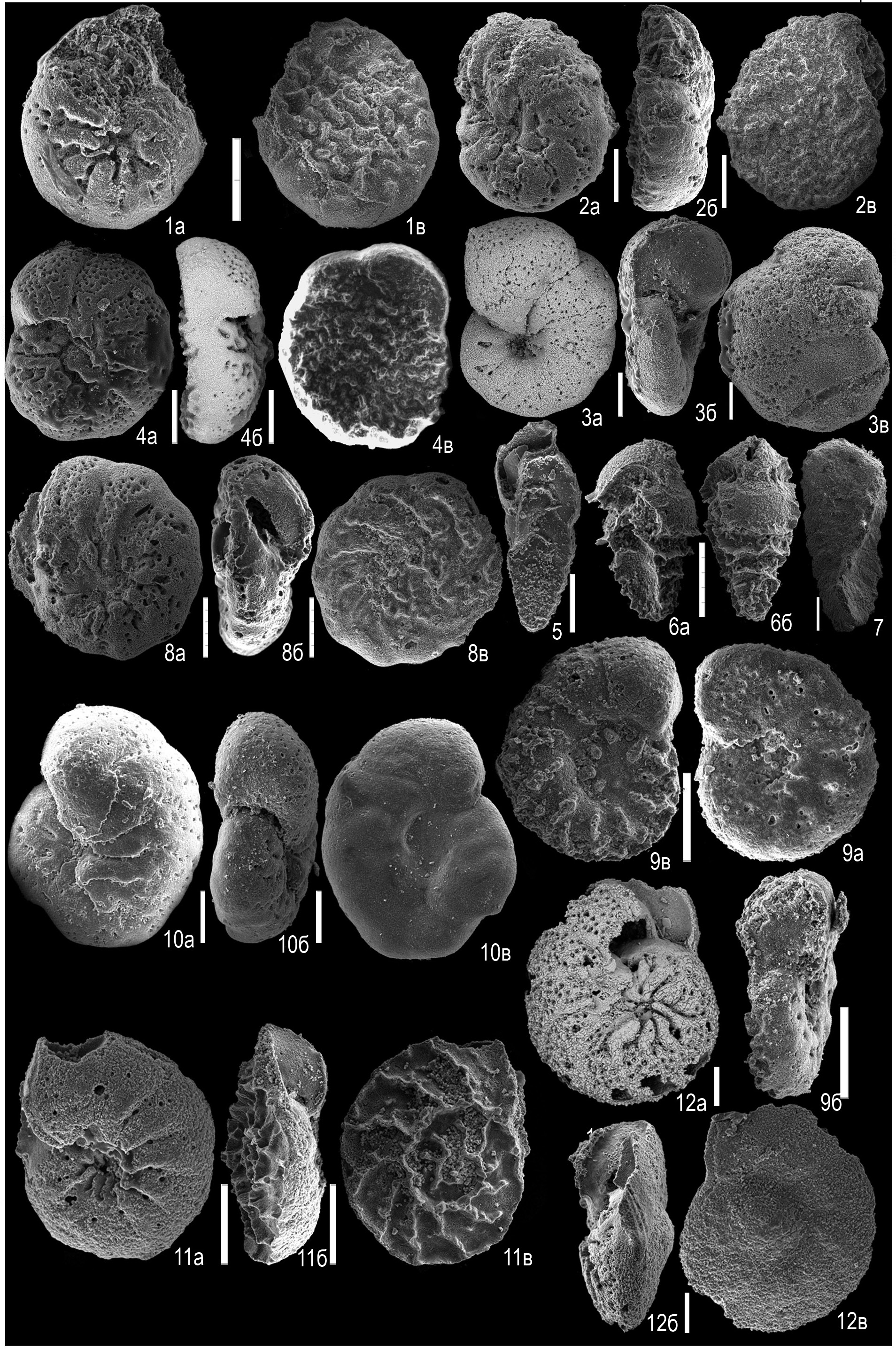 Таблица I. Бентосные фораминиферы из разреза Нижняя Банновка. a — вид с брюшной стороны, б — вид с периферического края, в — вид со спинной стороны. Длина масштабной линейки 100 мкм.
