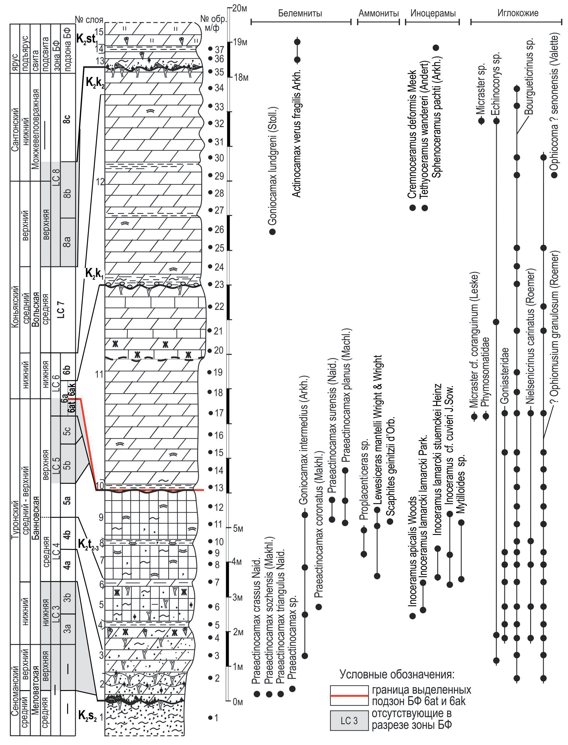 Таким образом, в стратотипе, в разрезе Нижняя Банновка, банновская свита представлена в объеме БФ зон LC4 (подзоны a и b) и LC5 (подзона a), которые характеризуют отложения среднего–верхнего подъярусов турона.