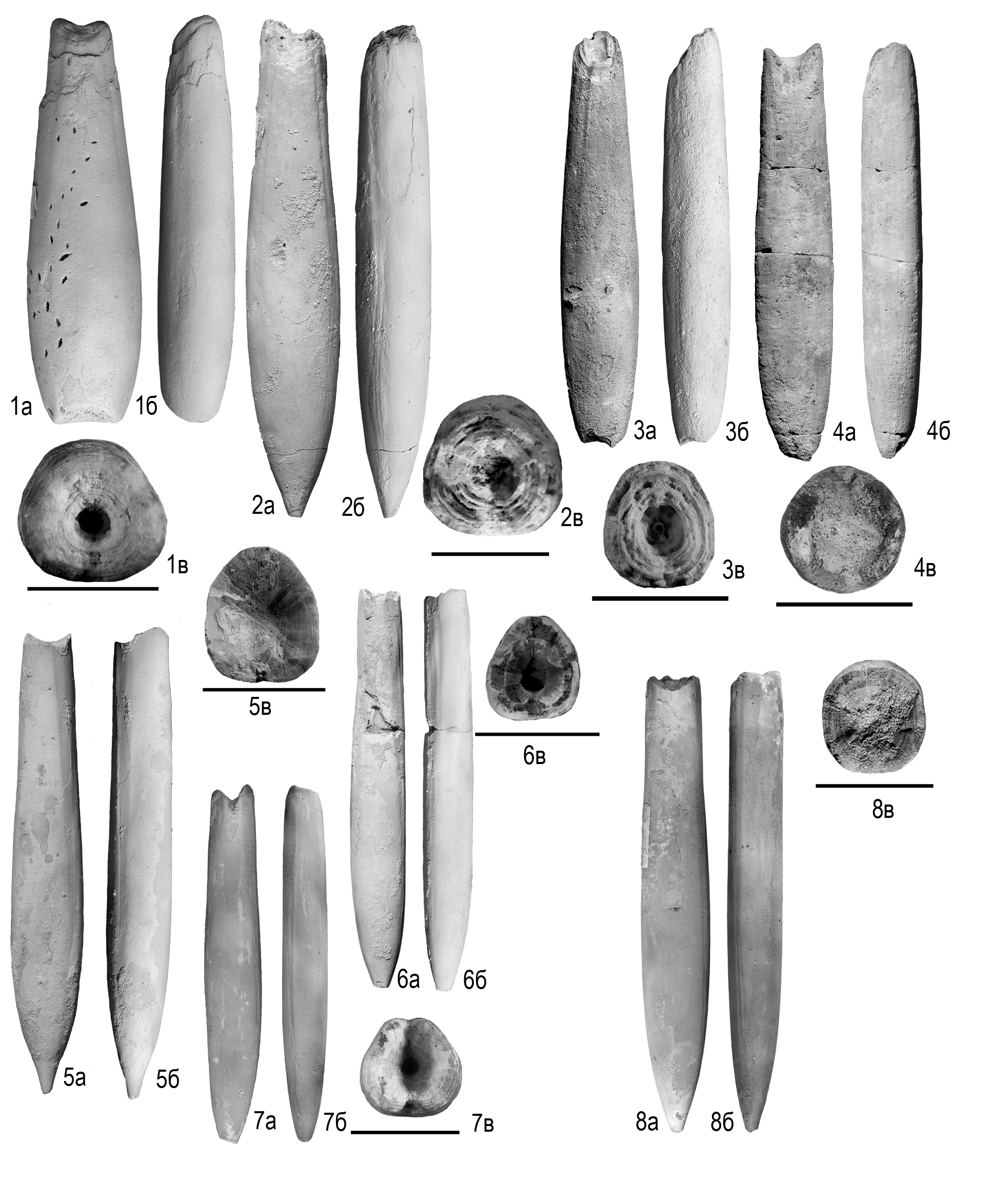 1 — Praeactinocamax crassus (Naidin), экз. СГУ SVB24/10: a — спинная сторона со следами посмертной биоэрозии, б — вид сбоку, в — спереди; банновская свита, слой 2; 2 — Praeactinocamax triangulus (Naidin), экз. СГУ SVB24/15: a — спинная сторона, б — сбоку, в — спереди; банновская свита, слой 2; 3 — Praeactinocamax sozhensis (Makhlin), экз. СГУ SVB24/16: a — спинная сторона, б — сбоку, в — со стороны альвеолы; банновская свита, слой 2; 4 — Praeactinocamax sp., экз. СГУ SVB24/37: a — спинная сторона, б — сбоку, в — спереди; банновская свита, слой 2; 5 — Goniocamax intermedius (Arkhangelsky), экз. СГУ SVB24/42: a — спинная сторона, б — сбоку, в — спереди; банновская свита, слой 5; 6 — Goniocamax lundgreni (Stolley), экз. СГУ SVB24/43: a — брюшная сторона, б — сбоку, в — спереди; вольская свита, слой 12; 7 — Praeactinocamax surensis (Naidin), экз. СГУ SVB24/49: a — брюшная сторона, б — сбоку, в — спереди; банновская свита, слой 9; 8 — Praeactinocamax coronatus (Makhlin), экз. СГУ SVB24/50: a — брюшная сторона, б — сбоку, в — спереди; банновская свита, слой 5