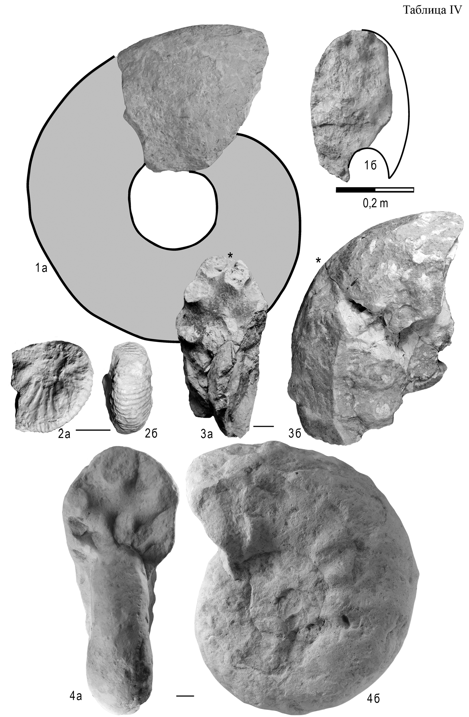 1 — Lewesiceras s.l., экз. СГУ SVB24/53: a — фрагмент фрагмокона и его положение на раковине, вид сбоку, б — спереди; банновская свита, слой 9; 2 — Scaphites geinitzii d’Orbigny, экз. СГУ SVB24/54: a — вид боку, б — вентральная сторона; банновская свита, слой 9; 3 — Lewesiceras mantelli Wright et Wright, экз. СГУ SVB24/55: * — начало жилой камеры; a — неполный фрагмокон, вид сбоку, б — со стороны перегородки; банновская свита, слой 9; 4 — Lewesiceras mantelli Wright et Wright, экз. СГУ SVB24/09: а — сбоку, б — со стороны перегородки (по Сельцер, Иванов, 2010, табл. 6, фиг. 1); банновская свита, осыпь слоя 7
