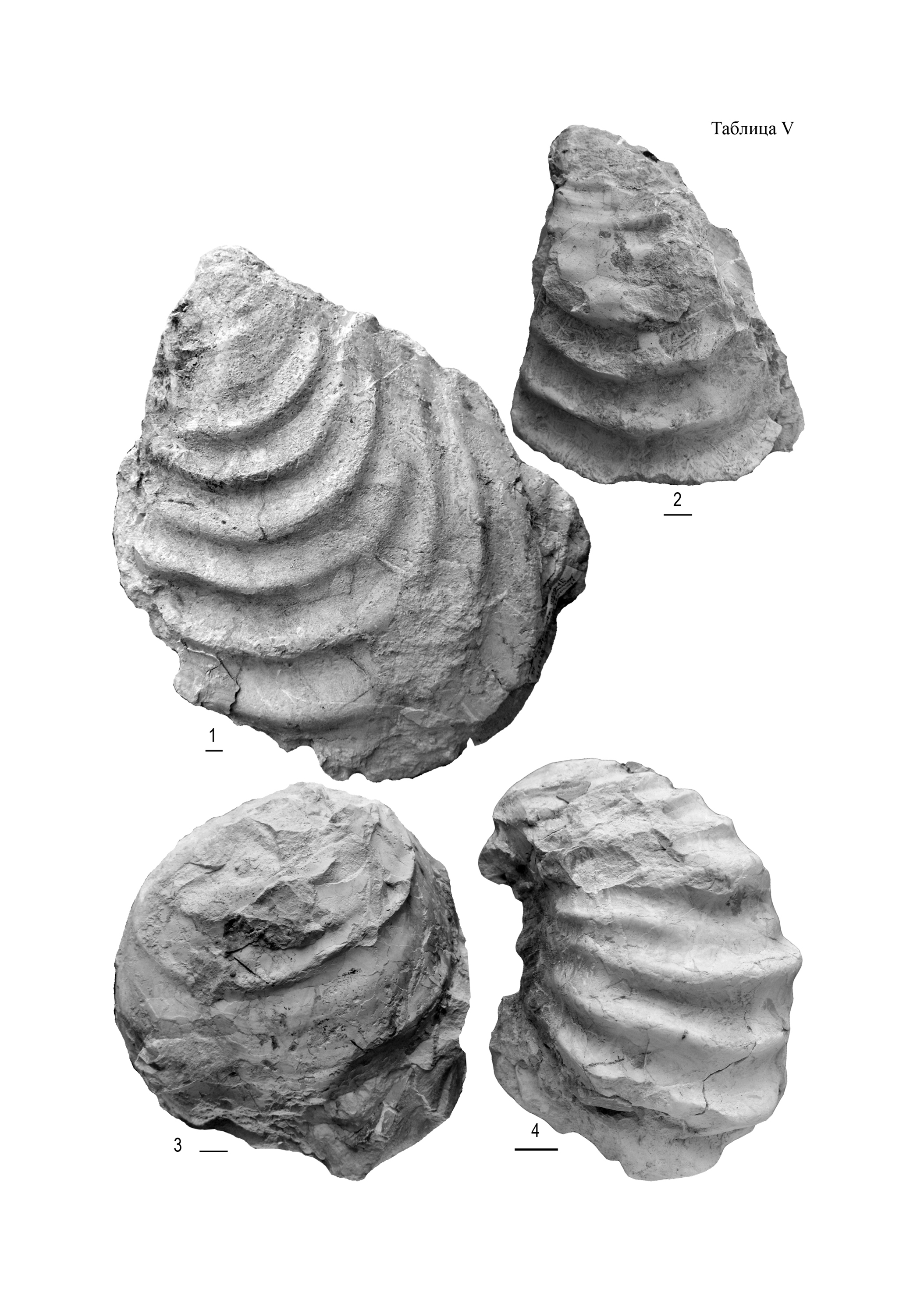 1 — Inoceramus lamarcki lamarcki Parkinson, экз. СГУ SVB 24/14, левая створка; банновская свита, слой 6; 2 — Inoceramus lamarcki stuemckei Heinz, экз. СГУ SVB 24/13, левая створка; банновская свита слой 6; 3 — Cremnoceramus deformis deformis Meek, экз. СГУ SVB 24/90, правая створка; вольская свита, слой 12; 4 — Tethyoceramus wandereri (Andert), экз. СГУ SVB 78/92, левая створка; вольская свита, слой 12