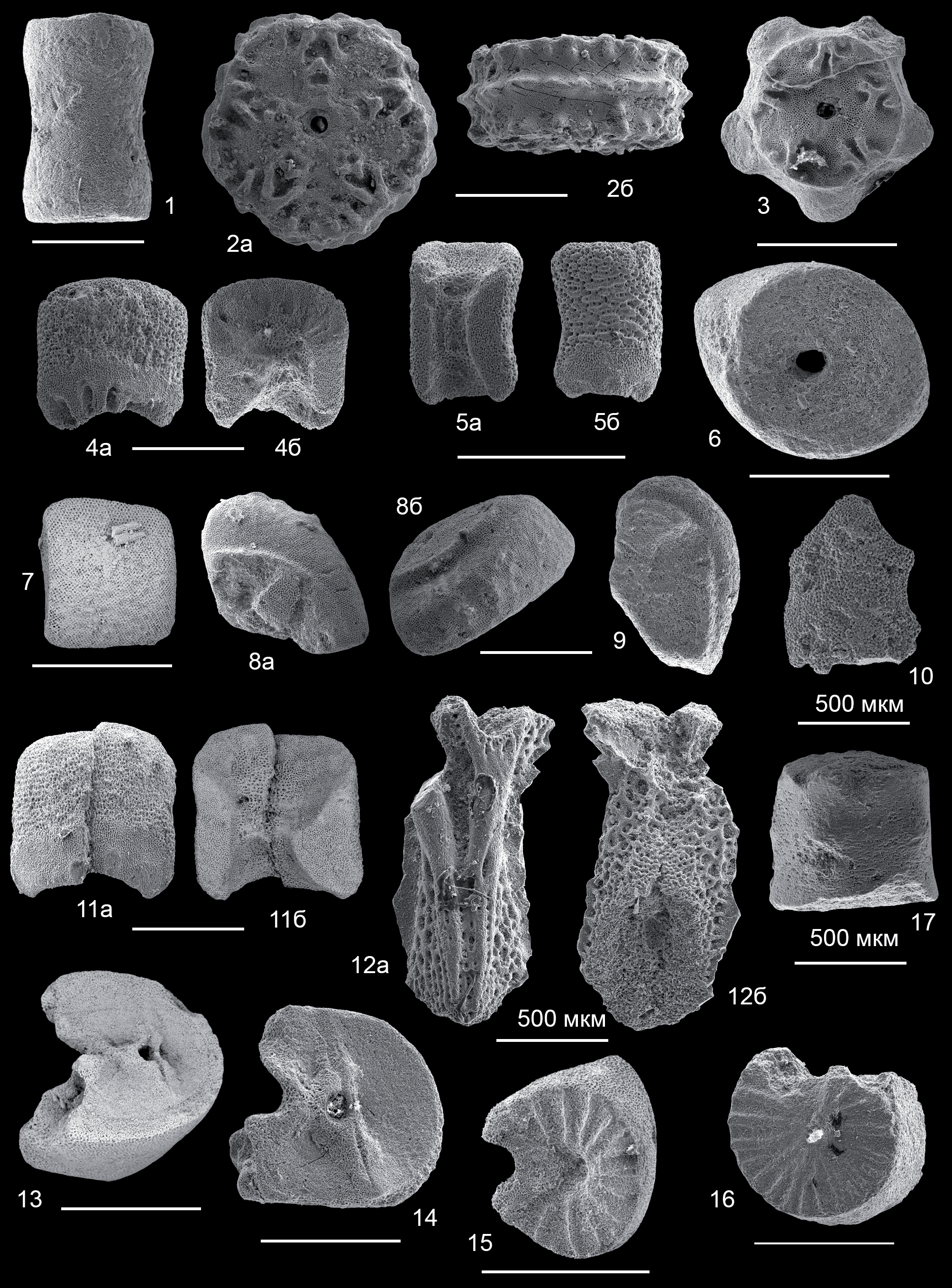 1 — Bourgueticrinus sp., обр. 4, экз. СГУ ЕАК № 207.1/NB-4-1, членик стебля, вид сбоку; 2 — Nielsenicrinus carinatus (Roemer), обр. 5, экз. СГУ ЕАК № 207.2/NB-5-1, членик стебля: a — вид со стороны поверхности сочленения, б — вид сбоку; 3 — Nielsenicrinus carinatus (Roemer), обр. 17, экз. СГУ ЕАК № 207.2/NB-17-1, членик стебля, вид со стороны поверхности сочленения; 4 —? Ophiomusium granulosum (Roemer), обр. 8, экз. СГУ ЕАК № 208.1/NB-8-1, боковая пластинка руки: a — вид с внешней стороны, б — вид с внутренней стороны; 5 —? Ophiomusium granulosum (Roemer), обр. 8, экз. СГУ ЕАК № 208.1/NB-8-2, боковая пластинка руки: a — вид с внутренней стороны, б — вид с внешней стороны; 6 — Bourgueticrinus sp., обр. 17, экз. СГУ ЕАК № 207.1/NB-17-1, членик стебля, вид со стороны поверхности сочленения; 7 — Goniasteridae gen. et sp. indet., обр. 9, экз. СГУ ЕАК № 209.1/NB-9-1, маргинальная пластинка; 8 — Goniasteridae gen. et sp. indet., обр. 17, экз. СГУ ЕАК № 209.1/NB-17-1, маргинальная пластинка; 9 — Goniasteridae gen. et sp. indet., обр. 8, экз. СГУ ЕАК № 209.1/NB-8-1, маргинальная пластинка; 10 —? Ophiocoma senonensis (Valette), обр. 15, экз. СГУ ЕАК № 208.2/NB-15-1, адоральная пластинка руки; 11 —? Ophiomusium granulosum (Roemer), обр. 8, экз. СГУ ЕАК № СГУ ЕАК № 208.1/NB-8-3, боковая пластинка руки: a — вид с внешней стороны, б — вид с внутренней стороны; 12 —? Drepanocrinus communis (Douglas), обр. 25, экз. СГУ ЕАК № 207.3/NB-25-1, вторая брахиальная табличка первого порядка (IBr2): a — вид с внешней стороны, б — вид с внутренней стороны; 13 — брахиальная табличка второго порядка (IIBr) представителя отряда Comatulida Clark, обр. 25, экз. СГУ ЕАК № 207.4/NB-25-1, вид со стороны поверхности сочленения; 14 — брахиальная табличка второго порядка (IIBr) представителя отряда Comatulida Clark, обр. 9, экз. СГУ ЕАК № 207.4/NB-9-1, вид со стороны поверхности сочленения; 15 — брахиальная табличка второго порядка (IIBr) представителя отряда Comatulida Clark, обр. 9, экз. СГУ ЕАК № 207.4/NB-9-2, вид со стороны сизигальной поверхности; 16 — брахиальная табличка второго порядка (IIBr) представителя отряда Comatulida Clark, обр. 17, экз. СГУ ЕАК № 207.4/NB-17-1, вид со стороны сизигальной поверхности; 17 — Bourgueticrinus sp., обр. 34, экз. СГУ ЕАК № 207.1/NB-34-1, членик стебля, вид сбоку