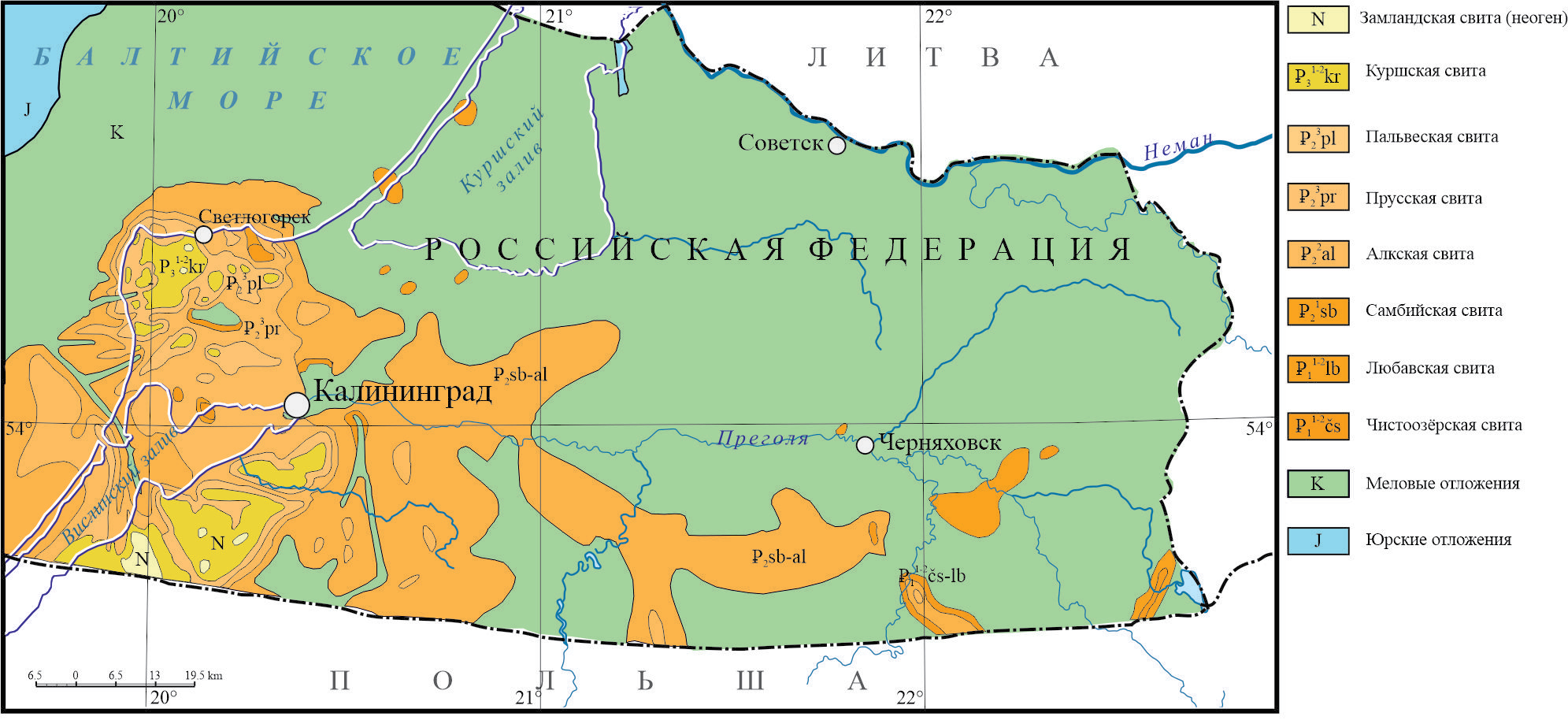 Рис. 1. Геологическая карта Калининградской области, демонстрирующая региональное распределение палеогеновых отложений (по Вербицкий и др., 2011, с упрощениями)