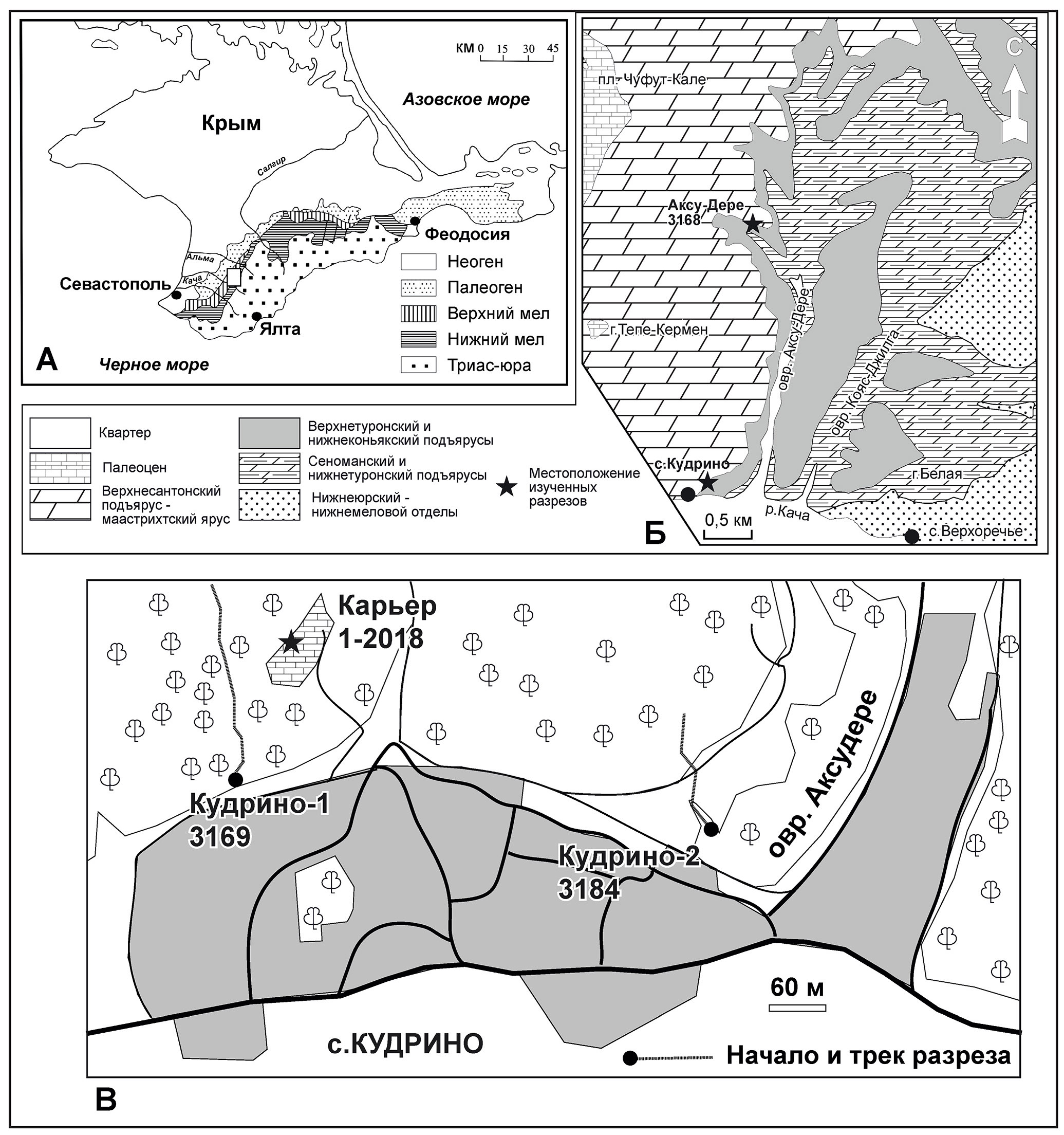 Кампан-маастрихтские отложения Юго-Западного Крыма хорошо известны в литературе благодаря своей стратиграфической полноте и схожести с разрезами Западной Европы. Хотя этот район исследовался многими поколениями геологов, разрезы требуют переизучения в связи с утверждением границ ярусов и обоснованием подъярусных границ. Ранее был комплексно (седиментология, ихнофоссилии, макро- и микрофауна, палинология, наннопланктон, изотопия, палео- и петромагнитный методы) изучен ряд разрезов, охватывающих пограничный интервал сантонского и кампанского ярусов и нижнюю часть кампанского яруса в районе оврага Аксу-Дере и северной окраины с. Кудрино (Гужиков и др., 2020, 2021а, 2021б) (рис. 1, 3). По своей охарактеризованности они не уступают кандидату еще не утвержденного глобального стратотипа (GSSP) кампана и рассматриваются в качестве дополнительного (auxiliary) разреза (Gale et al., 2023, p. 26).