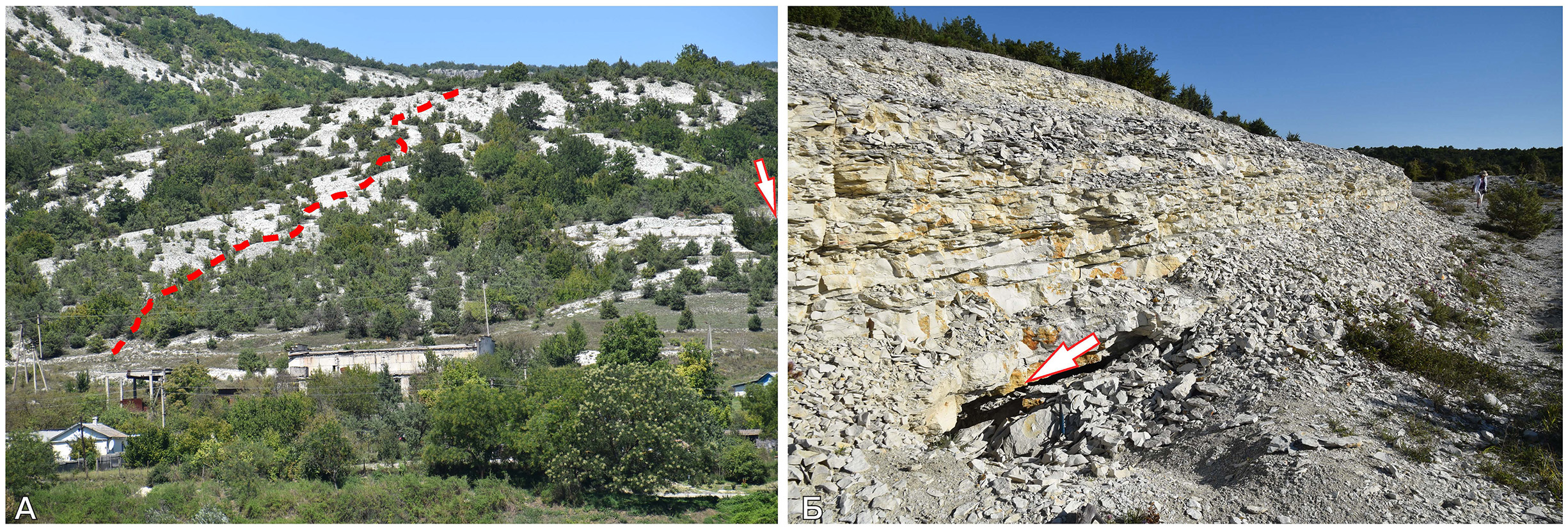 (а) — общий вид разреза Кудрино-1, примерный трек отбора образцов и положение заброшенного карьера (стрелка); (б) — фото заброшенного карьера, вскрывающего киловые глины (пачка XVII, ниже и левее стрелки), и место находки аммонита (стрелка)