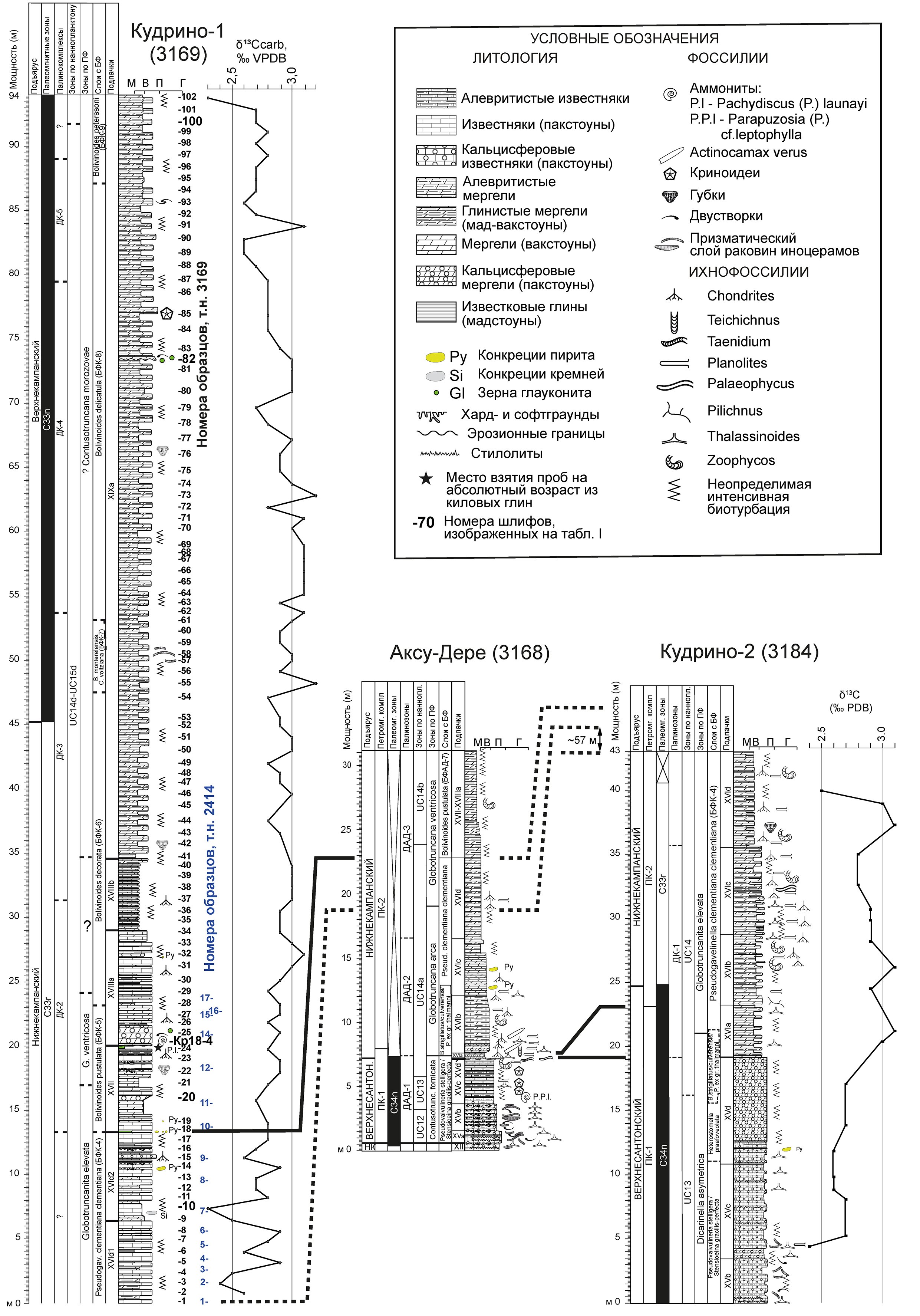 Микроскопическое строение пород и смена комплексов ихнофоссилий (Барабошкин, 2020; Гужиков и др., 2021а) подтверждают общую тенденцию углубления бассейна в первой половине кампана (Алексеев, 1989; Alekseev, Kopaevich, 1997 и др.). Как было показано при изучении разрезов Аксу-Дере и Кудрино-2 (Гужиков и др., 2021а), состав пород основания кампана отвечает стандартной микрофации 3 “пелагический мад-, вак-, пакстоун с планктонными микрофоссилиями”, характеризующей бассейновые фации или глубокий шельф (Flügel, 2010). Вместе с тем наблюдается отчетливый тренд от фораминиферовых пакстоунов подошвы кампана к вак-мадстоунам более высокой части разреза. При этом сравнительно богатые комплексы фораминифер вверх сменяются обедненными комплексами с редкими глобигериноподобными формами; сами раковины уменьшаются в размерах, а часть из них замещается кремнеземом. Этот тренд в целом отражен и в разрезе Кудрино-1, где преобладают фораминиферовые вакстоуны. В нижней части разреза местами зафиксировано значительное количество кальцисфер (подпачка XVII; табл. I, фиг. б), указывающих на стрессовые условия в водной массе. Отдельные уровни, связанные с небольшими перерывами, содержат единичные зерна глауконита (основание подпачки XVIIIa; табл. I, фиг. г). Мелкоалевритовые зерна кварца, предположительно имеющие эоловое происхождение, крайне редки (подпачка XIXa; табл. I, фиг. е). Названные признаки однозначно указывают на углубление бассейна и развитие условий глубокого шельфа с глинисто-карбонатным осадконакоплением. В интервале образцов 3169/85–3169/90 фиксируются признаки некоторого обмеления: увеличивается насыщенность пород крупными биокластами, в том числе раковинами бентосных фораминифер и фрагментами скелета иглокожих.