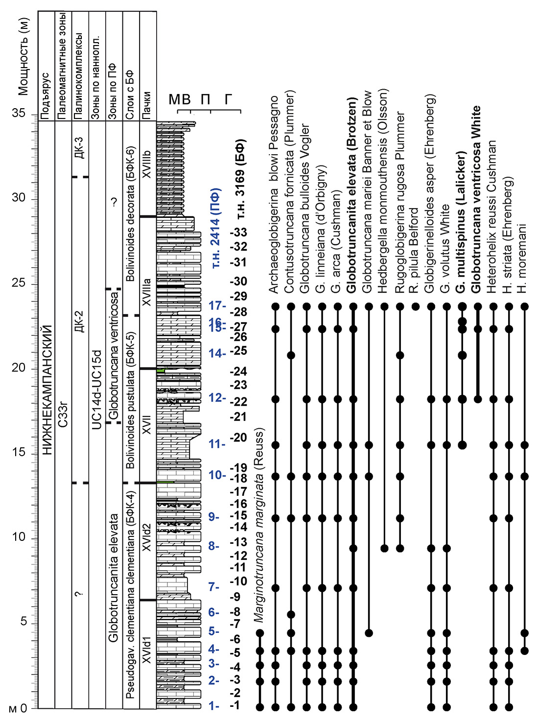 А.С. Алексеев (1989), вслед Н.И. Маслаковой (1977), отнес пачки XVI–XVIII нижнего кампана к зоне Globotruncanita elevata, а пачку XIX верхнего кампана — к зоне Globotruncana morozovae (= Contusotruncana morozovae (Vasilenko) в современной номенклатуре).