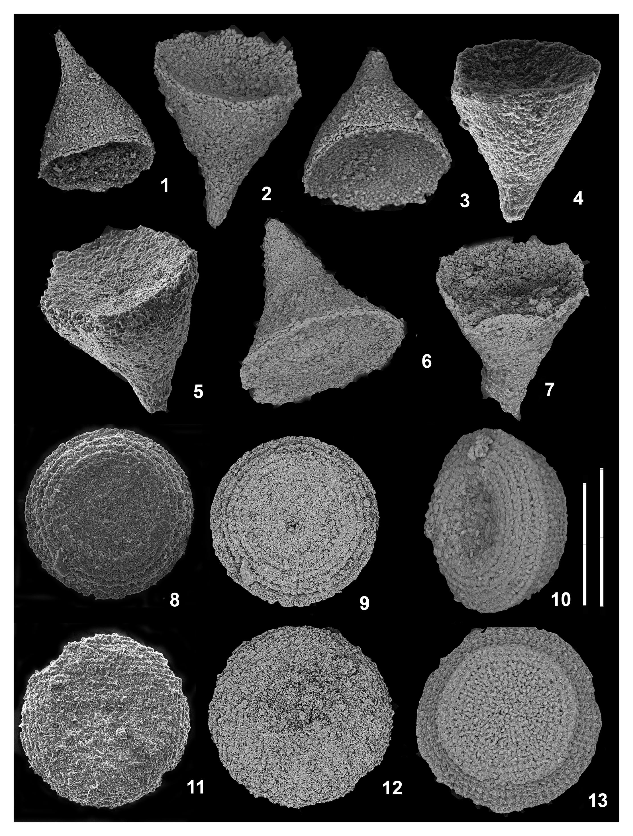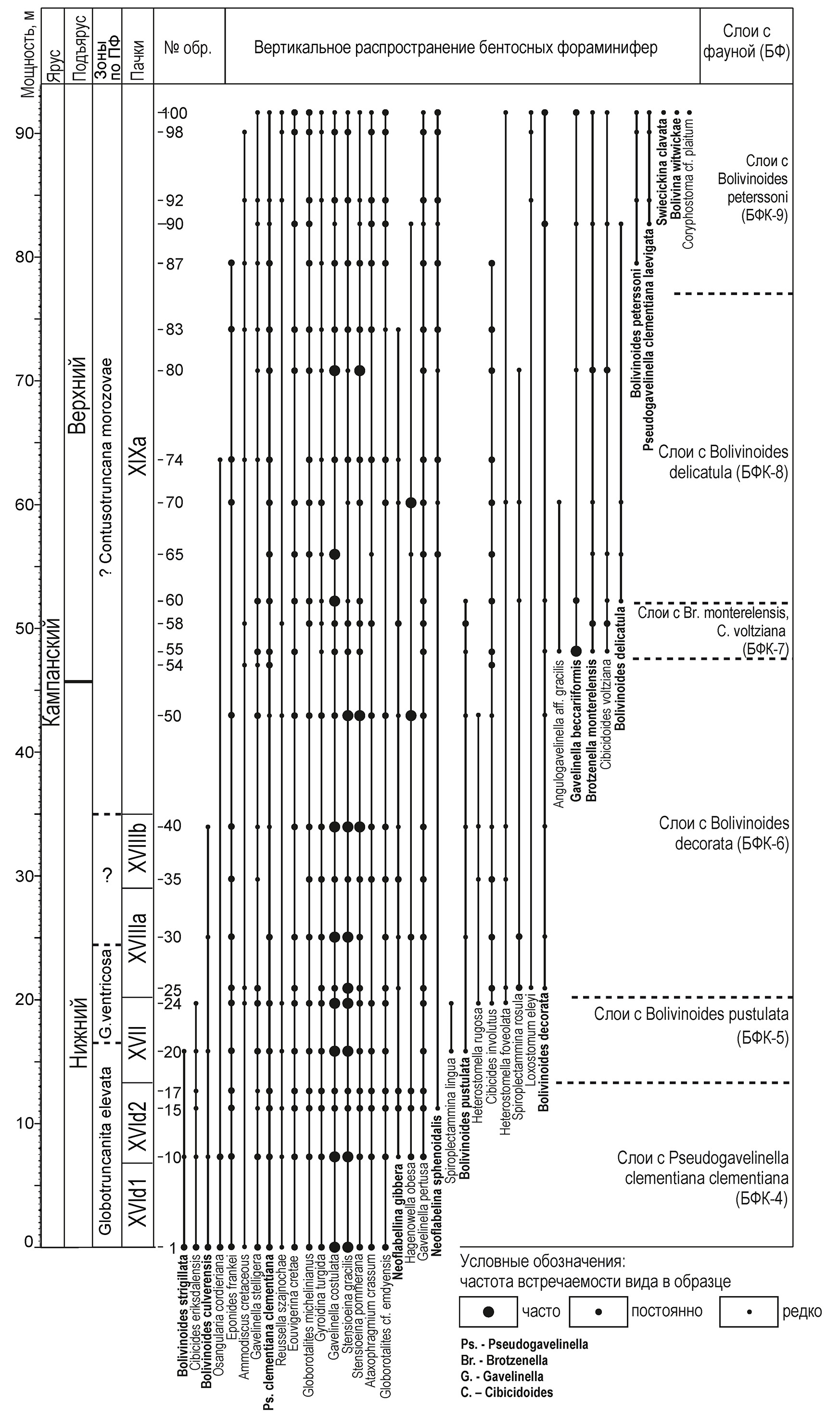 Таким образом, находки Sphaeroceramus cf. sarumensis и Cataceramus sp. ex gr. C. dariensis характеризуют зону Sphaeroceramus sarumensis–Cataceramus dariensis, в кровле которой проводится граница нижнего и верхнего кампана (Walaszczyk et al., 2016). Зона коррелируется с двумя фораминиферовыми зонами Bolivinoides granulatus [= B. pustulata]–Stensioeina gracilis и Bolivinoides decoratus (Walaszczyk et al., 2016), аналоги которых установлены и в рассматриваемом разрезе (см. ниже), или с интервалом между серединой зоны Offaster pilula (середина нижнего кампана) и зоной Gonioteuthis quadrata gracilis/Belemnitella mucronata (верхняя часть нижнего кампана) (Jagt et al., 2004). К сожалению, мы не знаем точного положения указанных экземпляров в разрезе, но даже если бы знали, то все равно было бы невозможно наметить положение кровли названной иноцерамовой зоны и надежно зафиксировать границу нижнего и верхнего кампана.