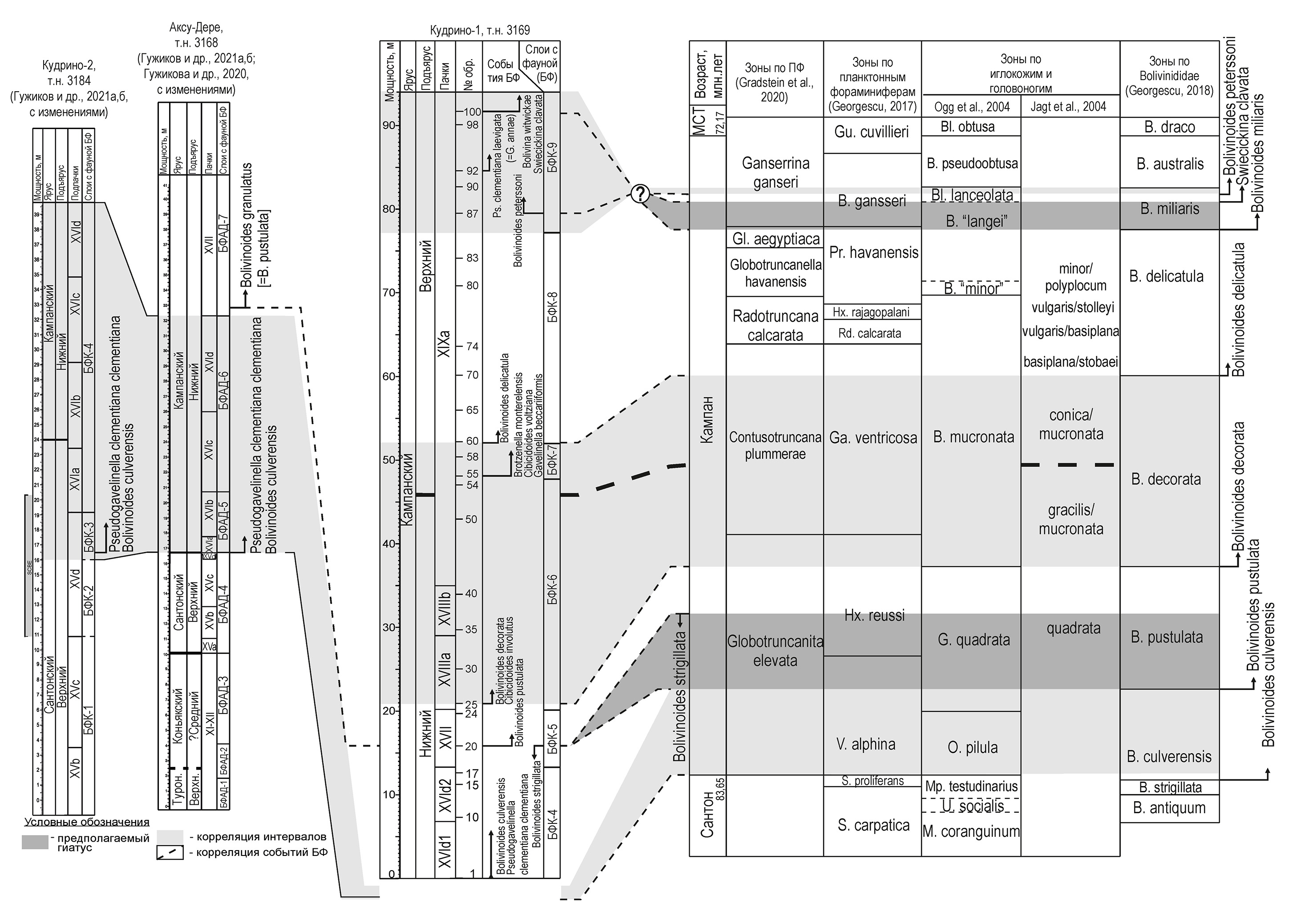 Первое появление вида B. pustulata, который ранее определялся как B. granulatus (Hofker) (Гужиков и др., 2021а), фиксируется в средней–верхней частях нижнего кампана ЕПО (Gawor-Biedowa, 1992; Magniez-Jannin, 1995). В разрезах Англии и в Северо-Западной Германии его появление отмечено внутри зоны Galeola senonensis (Swiecicki, 1980; Schönfeld, 1990), а в Прикарпатье — в основании иноцерамовой зоны Sphaeroceramus sarumensis–Cataceramus dariensis (Walaszczyk et al., 2016), аналоги которой присутствуют и в разрезе Кудрино-1 (см. выше). Согласно данным глубоководного бурения (Georgesсu, 2018), первое появление B. pustulata выявлено в верхней части зоны Heterohelix reussi, что соответствует нижней части белемнитовой зоны Gonioteuthis quadrata (Ogg et al., 2004). Поэтому возраст пачки XVII определен как вторая половина раннего кампана. Ранее аналогичный комплекс БФ был выявлен в разрезе Аксу-Дере (Гужиков и др., 2021а) с аббревиатурой БФАД-7.