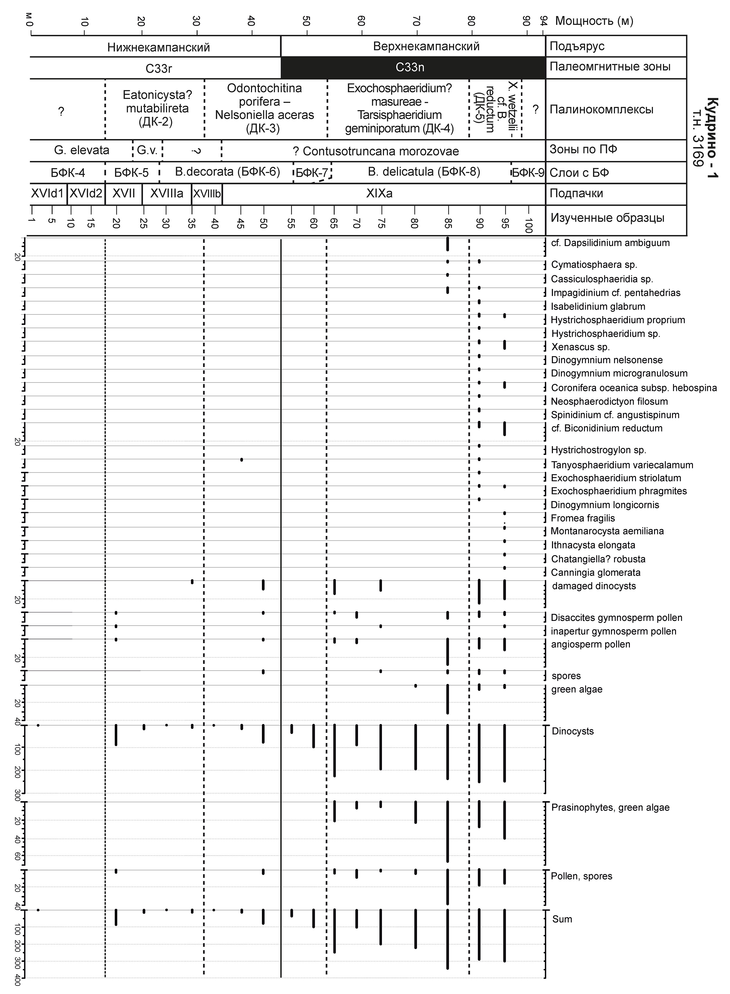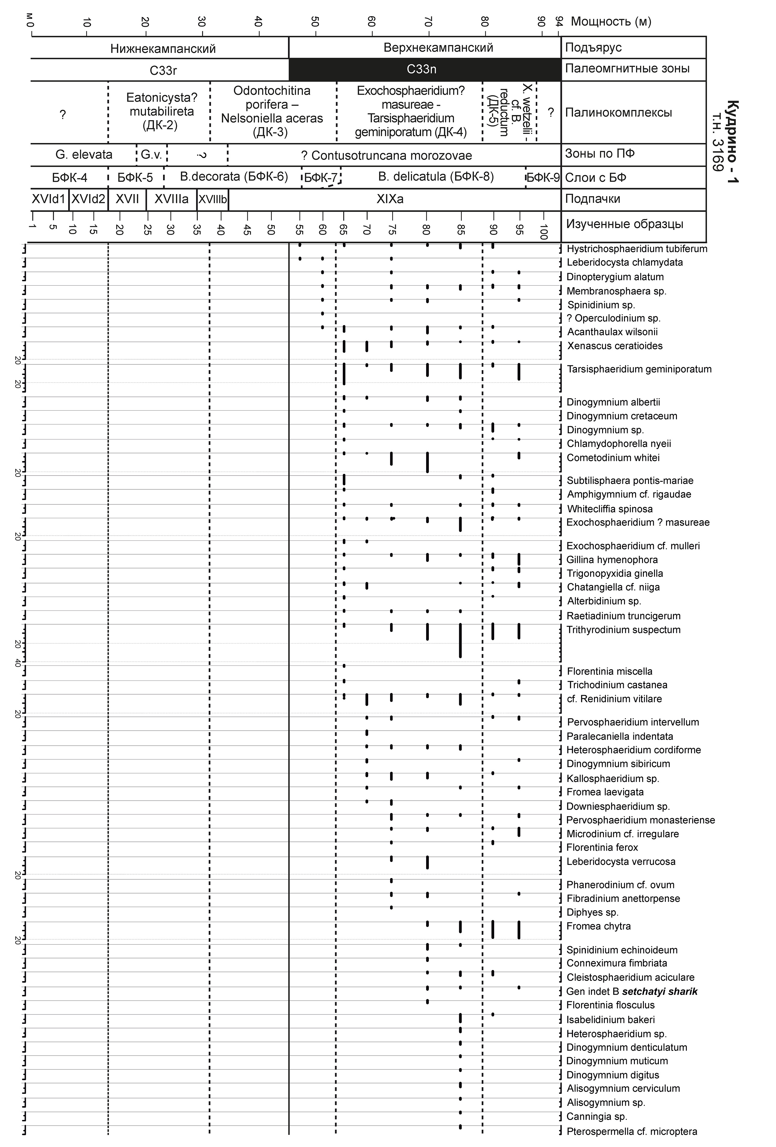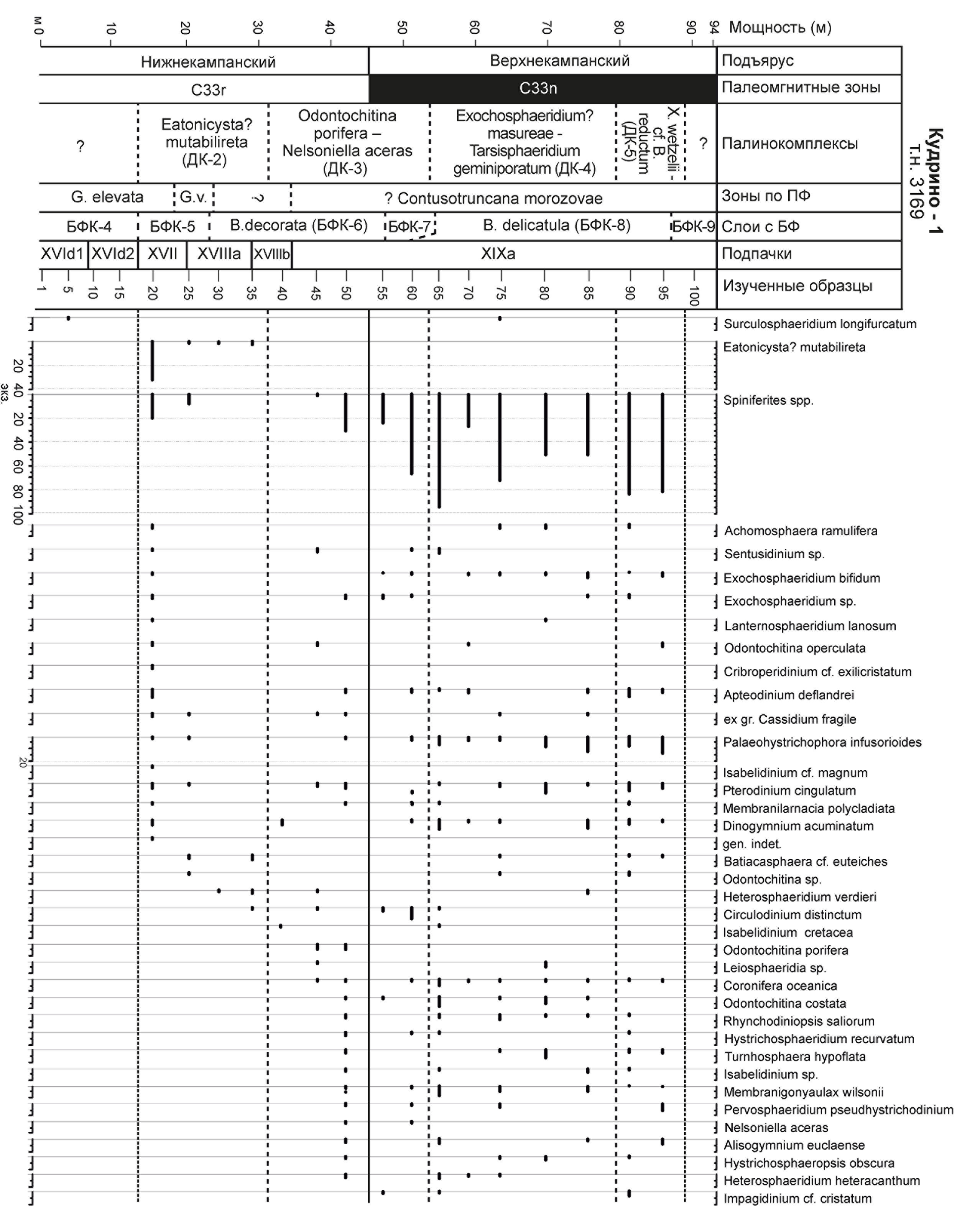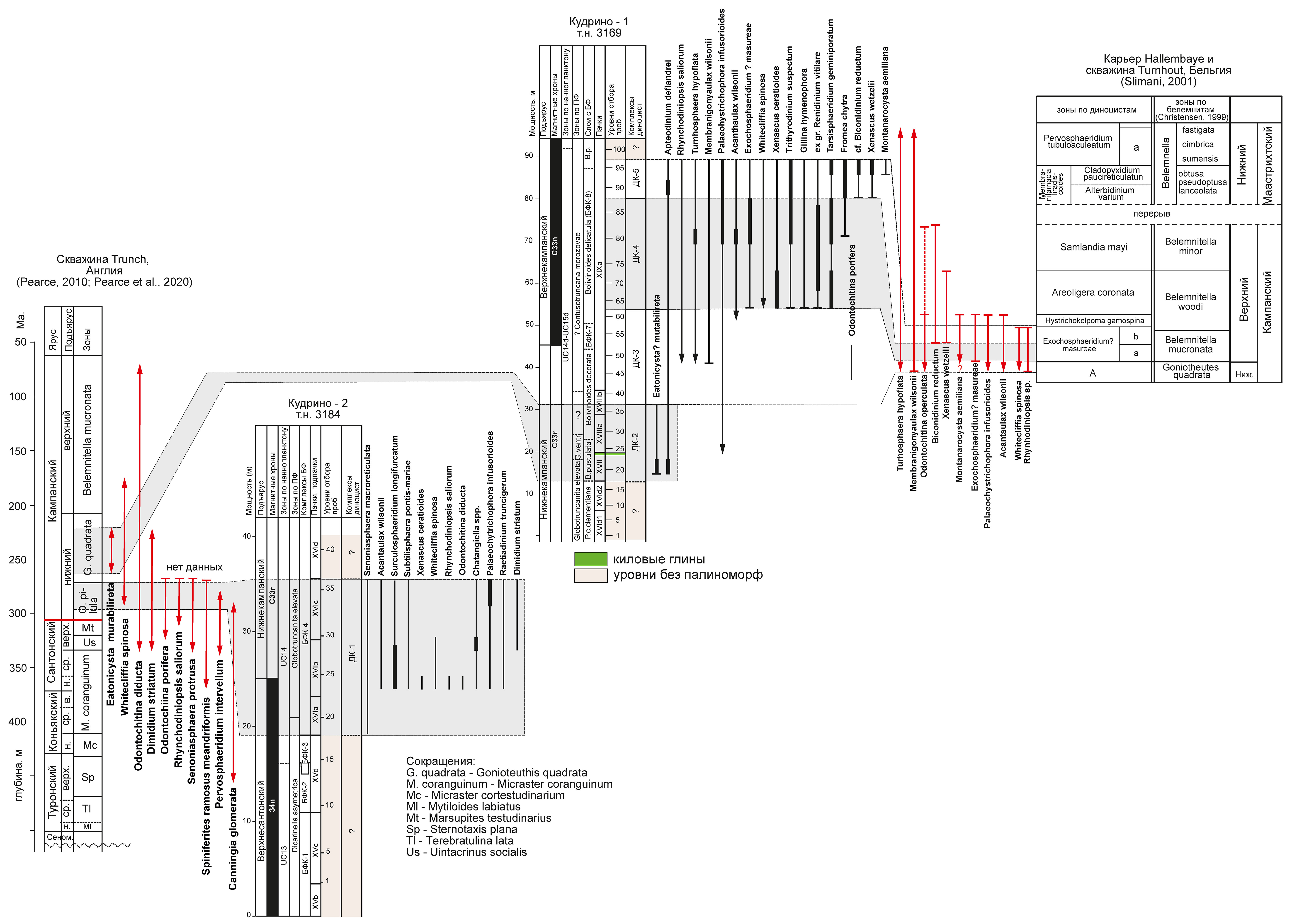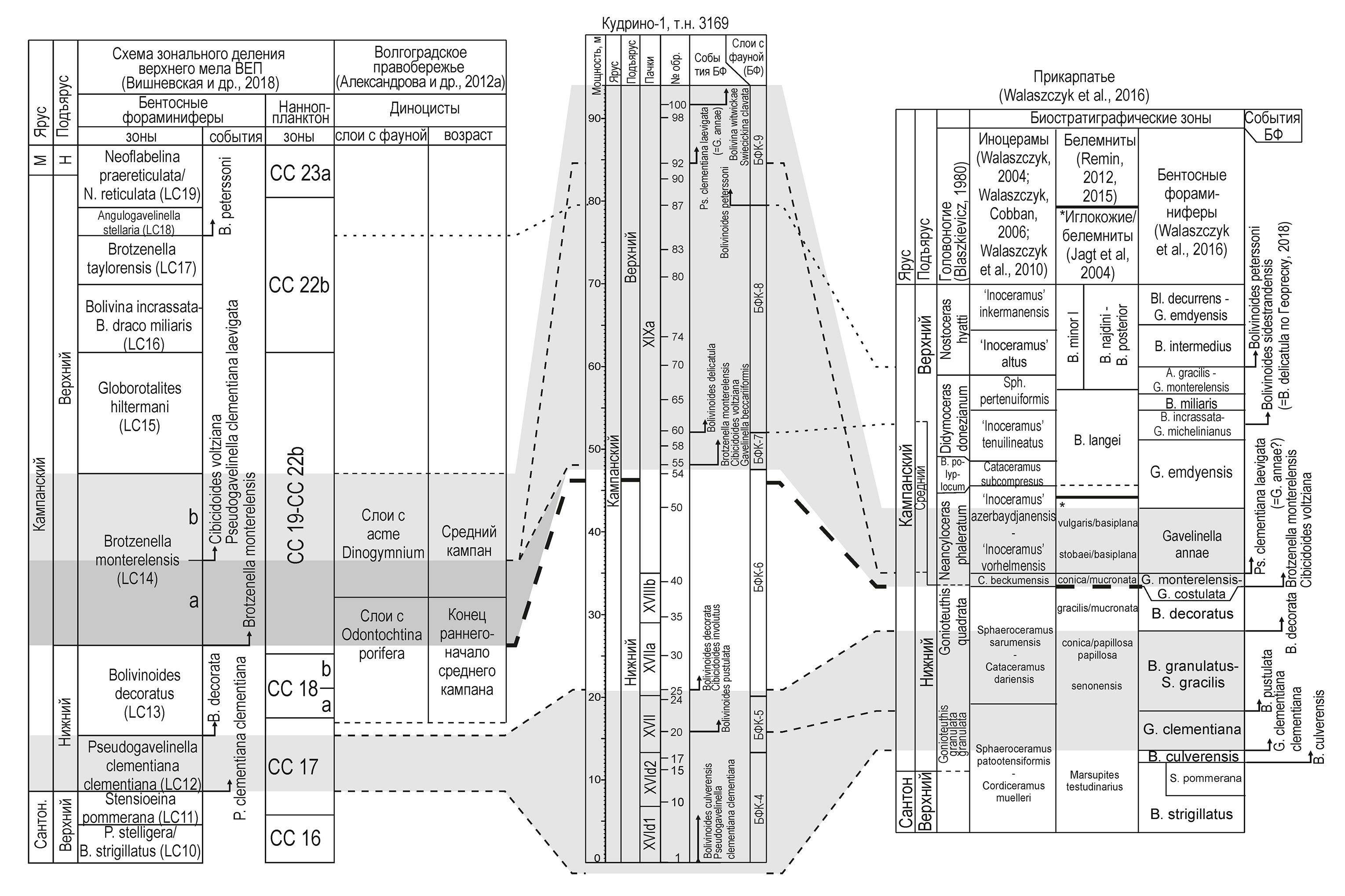 Появление видов Br. monterelensis и C. voltziana в зональной схеме В.Н. Беньямовского по БФ для ВЕП (Беньямовский, 2008) указывает на основание как зоны LC14, так и ее верхней подзоны LC14b, положение которой соответствует нижней части верхнего кампана ОСШ (Вишневская и др., 2018). Одновременное появление в разрезе Кудрино-1 этих видов-индексов может указывать на вероятность перерыва в объеме подзоны LC14а, но это нуждается в проверке по другим данным.