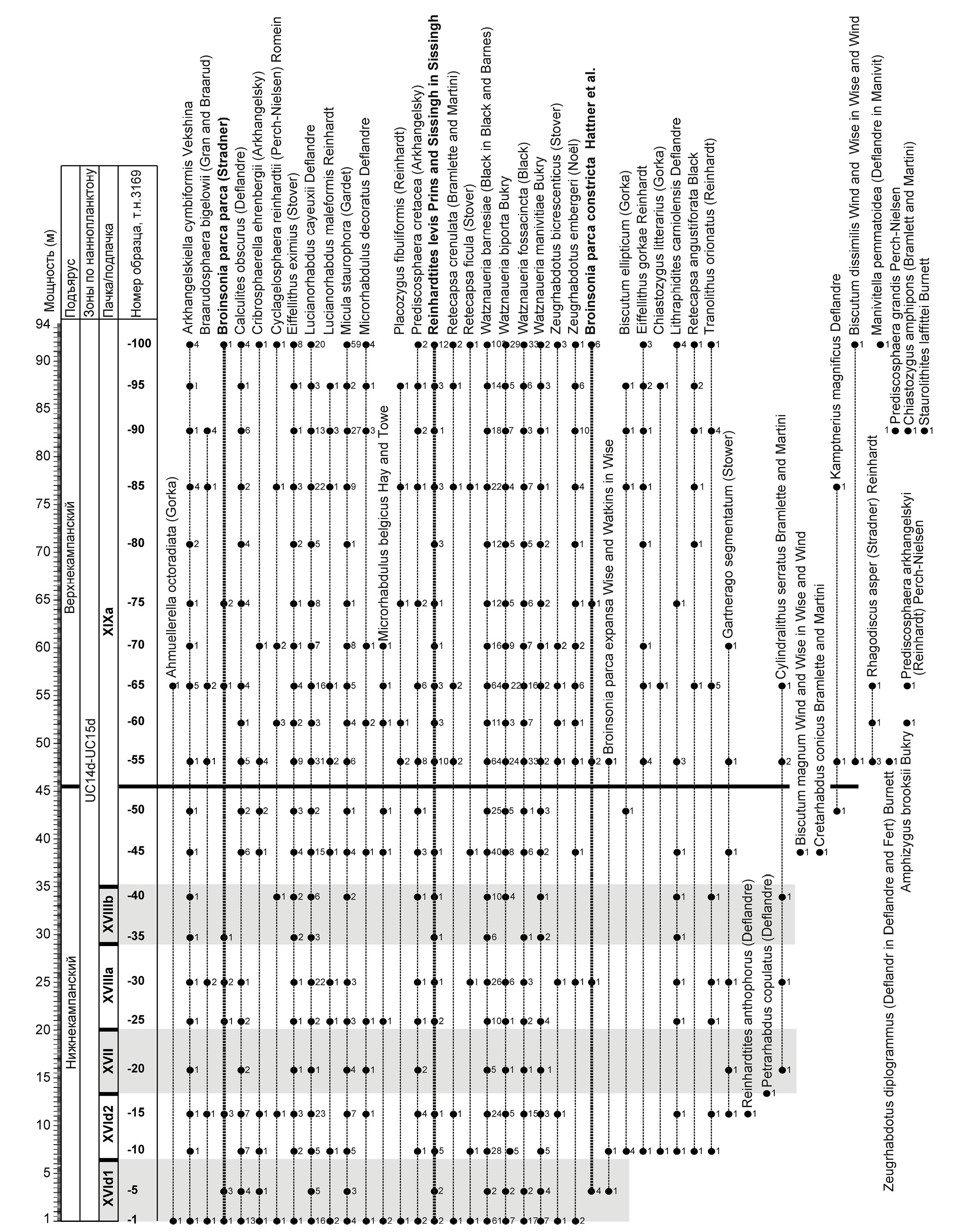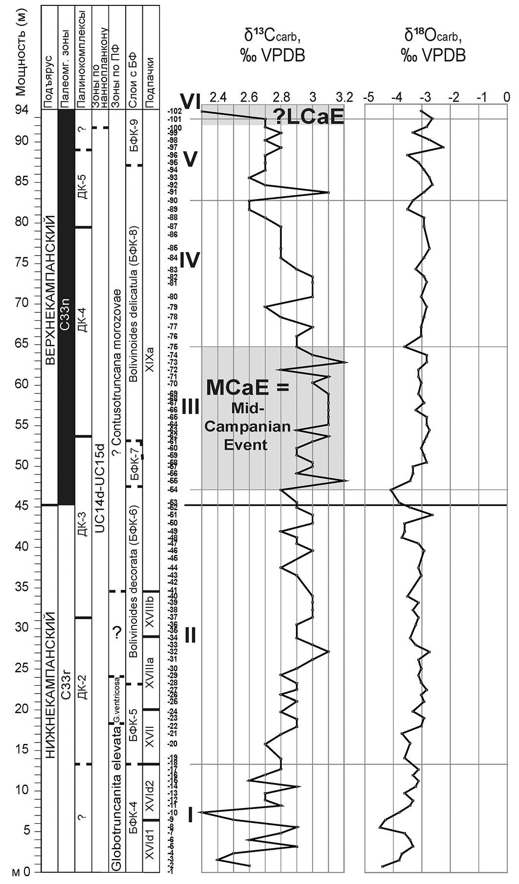 Разделение кампанского яруса на два или три подъяруса находится в стадии обсуждения (Hancock, Gale, 1996; Gradstein et al., 2012, 2020; Барабошкин и др., 2013), и каких-либо общепринятых критериев и предложений на этот счет пока не существует. Поэтому за основу нами принято двучленное деление кампана в соответствии с действующей Общей стратиграфической шкалой России (Олферьев, Алексеев, 2002).