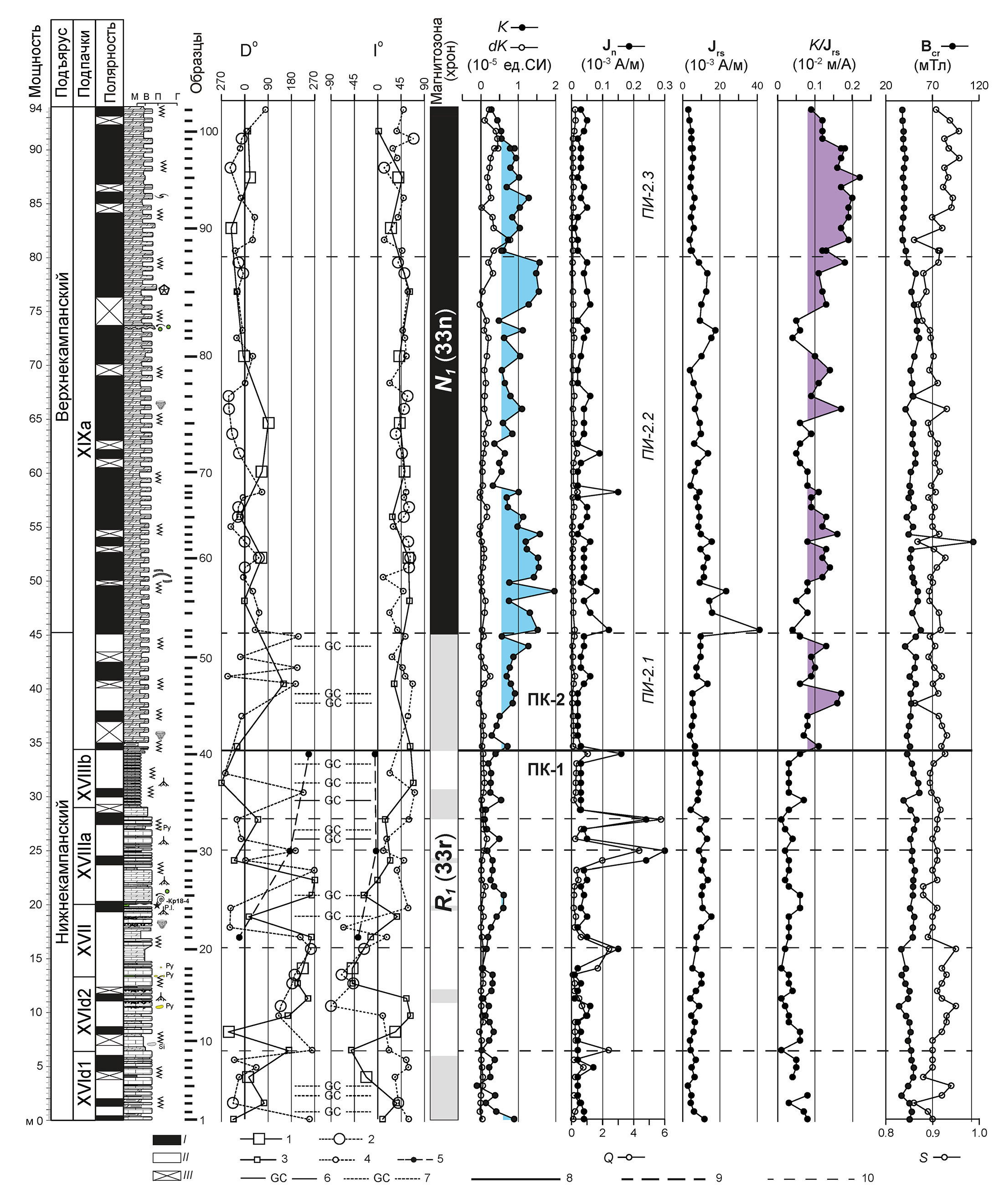 В 2021 г., вслед за (Hancock, Gale, 1996), мы предложили проводить границу сантонского и кампанского ярусов по смене магнитной полярности в подошве хрона C33r (Гужиков и др., 2021б). На этом же уровне данная граница была показана в работах предшественников (Gradstein et al., 2012, 2020 и др.), и в настоящее время именно этот признак принят в качестве первичного маркера для выбора GSSP в разрезе Боттачионе (Губбио, Италия; Gale et al., 2023). В настоящей статье мы принимаем упомянутую (но еще не утвержденную) границу сантонского и кампанского ярусов в подошве хрона C33r разреза Кудрино-2 (рис. 2).