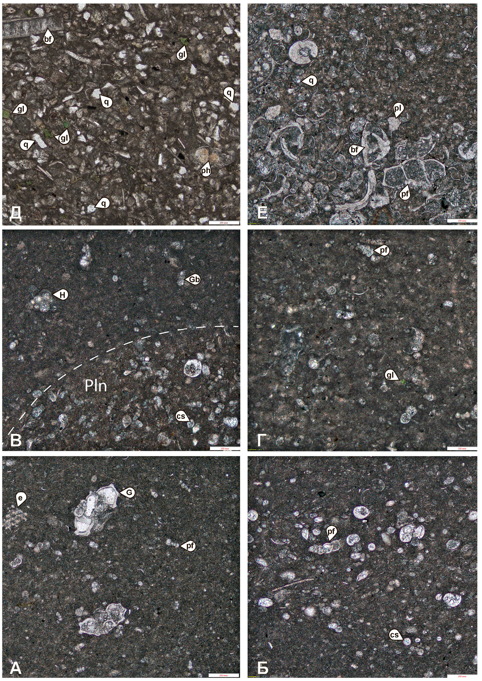 (а) — обр. 3169/10, фораминиферовый вакстоун, подпачка XVId2; (б) — обр. 3169/20, фораминиферово-кальцисферовый пак-вакстоун, пачка XVII; (в) — обр. 3169/30, кальцисферово-фораминиферовый вакстоун, пачка XVIIIa, краевая часть норы Planolites isp. (Pln); (г) — обр. Кр18–4, фораминиферовый вакстоун, основание пачки XVIIIa, в месте находки аммонита; (д) — обр. 3169/82, алевритистый биокластовый пакстоун с зернами глауконита и фосфатизированными фораминиферами, средняя часть подпачки XIXa; (е) — обр. 3169/100, фораминиферовый пакстоун — фрагмент копролита (?) в фораминиферовом вакстоуне, верхняя часть подпачки XIXa. Сокращения: биокласты: b — двустворки; e — иглокожие, фораминиферы: bf — бентосные, pf — планктонные: G — глоботрунканы, Gb — глобигерины, H — гетерохелициды; cs — кальцисферы, ph — фосфатизированные фораминиферы; pl — фрагменты призматического слоя раковин иноцерамов; другие зерна: q — кварц; gl — глауконит. Все фото сделаны в неполяризованном свете на микроскопе Olympus-BX43 камерой Olympus-DP71 ЦКП МГУ. Масштабная линейка 200 мкм