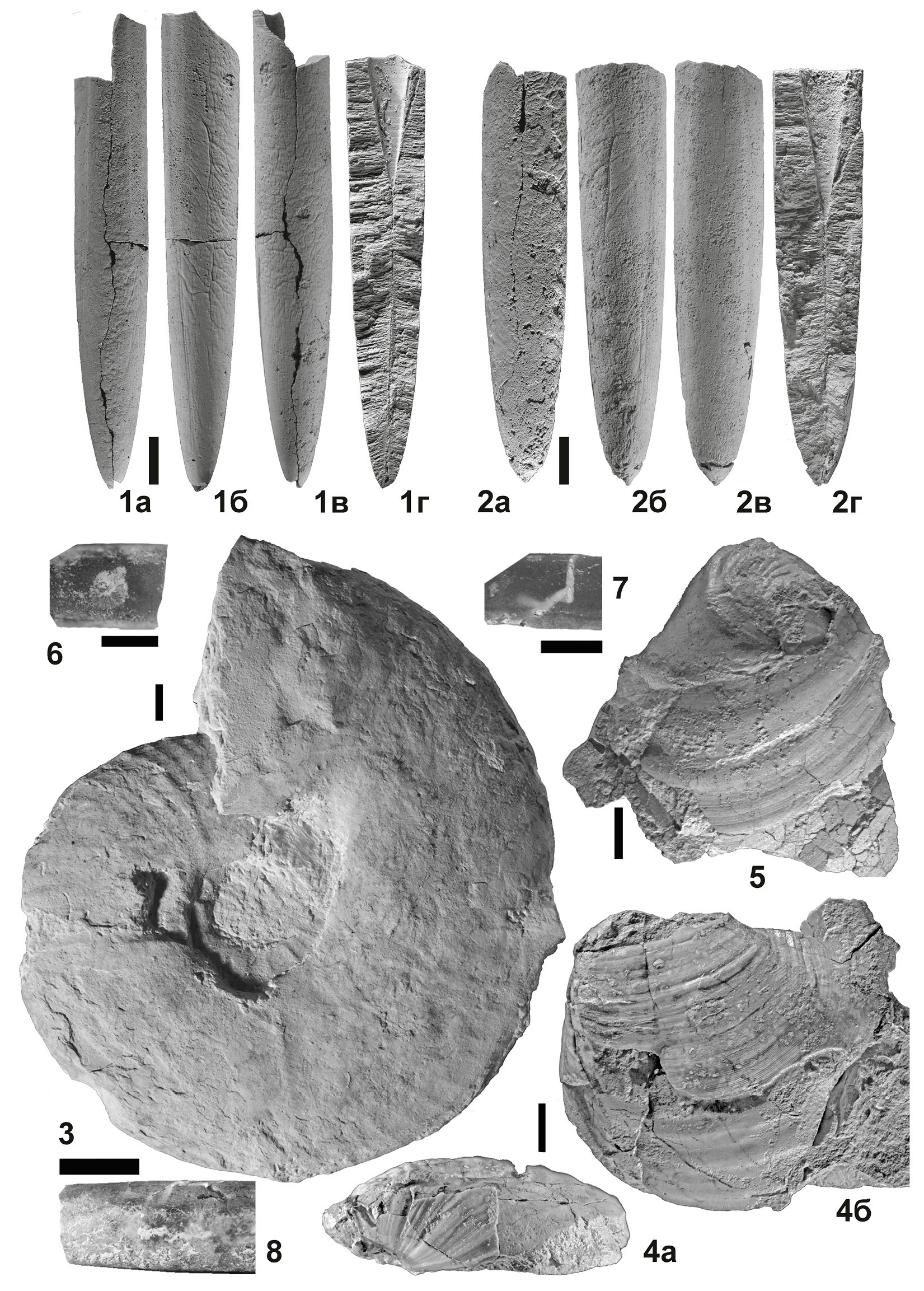 1, 2 — Belemnitella mucronata (v. Schlotheim): 1 — экз. МЗ МГУ № 149-4, 2 — экз. МЗ МГУ № 149-5; а — вид со спинной стороны, б — вид сбоку, в-вид с брюшной стороны, г — вид спинно-брюшного раскола; 3 — Pachydiscus (Pachydiscus) launayi (De Grossouvre), экз. № МЗ МГУ 149-1, сбоку; 4 — Sphaeroceramus cf. sarumensis (Woods, 1912), экз. МЗ МГУ № 149-2: а — правая створка, б — ее вид со стороны переднего края; 5 — Cataceramus sp. ex gr. dariensis (Dobrov et Pavlova), экз. МЗ МГУ № 149-3, сверху; 6 — Dendrina dendrina (Morris, 1851) на ростре Belemnitella mucronata, экз. МЗ МГУ № 149-4; 7 — Talpina ramosa von Hagenow, 1840 на ростре Belemnitella sp., экз. МЗ МГУ № 149-6; 8 — Calcideletrix flexuosa Mägdefrau, 1937, экз. МЗ МГУ № 149-6. Находки происходят из осыпи на подпачках XVIIc (фиг. 1, 2, 6–8, верхний кампан, разрез Кудрино-3) и XVIIIa (фиг. 3–5, нижний кампан, разрез Кудрино-1)