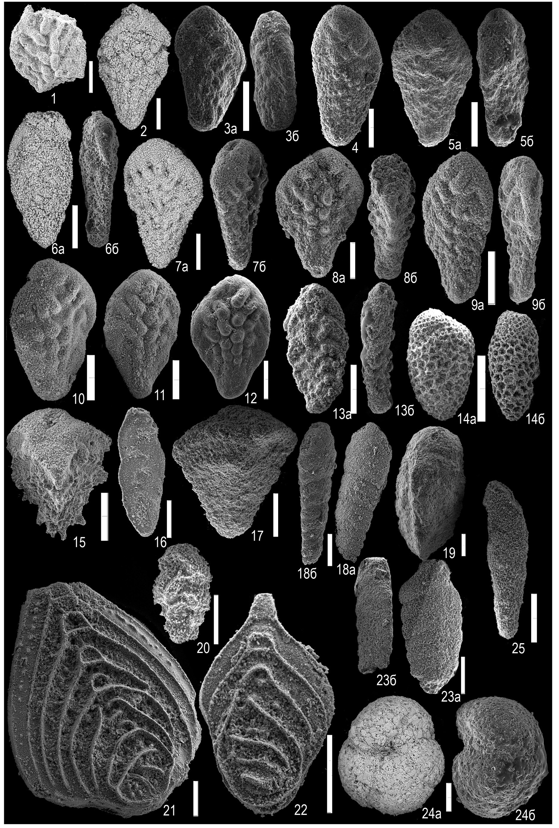 1 — Bolivinoides strigillata (Chapman), обр. 3169/20, экз. SSU IPR № 263/3169-20-14; 2 — Bolivinoides strigillata (Chapman), обр. 3169/10, экз. SSU IPR № 263/3169-10-26; 3 — Bolivinoides culverensis Barr, обр. 3169/10, экз. SSU IPR № 263/3169-10-25; 4 — Bolivinoides pustulata Reuss, обр. 3169/20, экз. SSU IPR № 263/3169-20-15; 5 — Bolivinoides pustulata Reuss, обр. 3169/20, экз. SSU IPR № 263/3169-20-27; 6 — Trachelinella watersi (Cushman), обр. 3169/60, экз. SSU IPR № 263/3169-60-45; 7 — Bolivinoides decorata (Jones), обр. 3169/30, экз. SSU IPR № 263/3169-30-33; 8 — Bolivinoides decorata (Jones), обр. 3169/55, экз. SSU IPR № 263/3169–55–41; 9 — Bolivinoides delicatula Cushman, обр. 3169/60, экз. SSU IPR № 263/3169-60-46; 10 — Bolivinoides peterssoni Brotzen, обр. 3169/87, экз. SSU IPR № 263/3169-87-96; 11 — Bolivinoides peterssoni Brotzen, обр. 3169/92, экз. SSU IPR № 263/3169-92-93; 12 — Bolivinoides peterssoni Brotzen, обр. 3169/100, экз. SSU IPR № 263/3169-100-12; 13 — Swiecickina clavata (Plotnikova), обр. 3169/100, экз. SSU IPR № 263/3169-100-65; 14 — Bolivina witwickae Gawor-Biedowa, обр. 3169/100, экз. SSU IPR № 263/3169-100-67; 15 — Reussella szajnochae (Grzybowski), обр. 3169/55, экз. SSU IPR № 263/3169-55-24; 16 — Loxostomum eleyi (Cushman), обр. 3169/20, экз. SSU IPR № 263/3169-20-16; 17 — Spiroplectammina lingua Akimetz, обр. 3169/20, экз. SSU IPR № 263/3169-20-28; 18 — Spiroplectoides rosula (Ehrenberg), обр. 3169/25, экз. SSU IPR № 263/3169-25-29; 19 — Heterostomella foveolata (Marsson), обр. 3169/25, экз. SSU IPR № 263/3169-25-31; 20 — Eouvigerina cretae (Ehrenberg), обр. 3169/55, экз. SSU IPR № 263/3169-55-99; 21 — Neoflabellina sphenoidalis (Wedekind), обр. 3169/83, экз. SSU IPR № 263/3169-83-78; 22 — Neoflabellina gibbera (Wedekind), обр. 3169/30, экз. SSU IPR № 263/3169-30-32; 23 — Spiroplectoides rosula (Ehrenberg), обр. 3169/30, экз. SSU IPR № 263/3169-30-34; 24 — Hagenowella obesa (Reuss), обр. 3169/50, экз. SSU IPR № 263/3169–50–38; 25 — Coryphostoma cf. plaitum (Carsey), обр. 3169/100, экз. SSU IPR № 263/3169-100-68. a — вид с брюшной стороны, б — вид с периферического края, в — вид со спинной стороны. Длина масштабной линейки 100 мкм