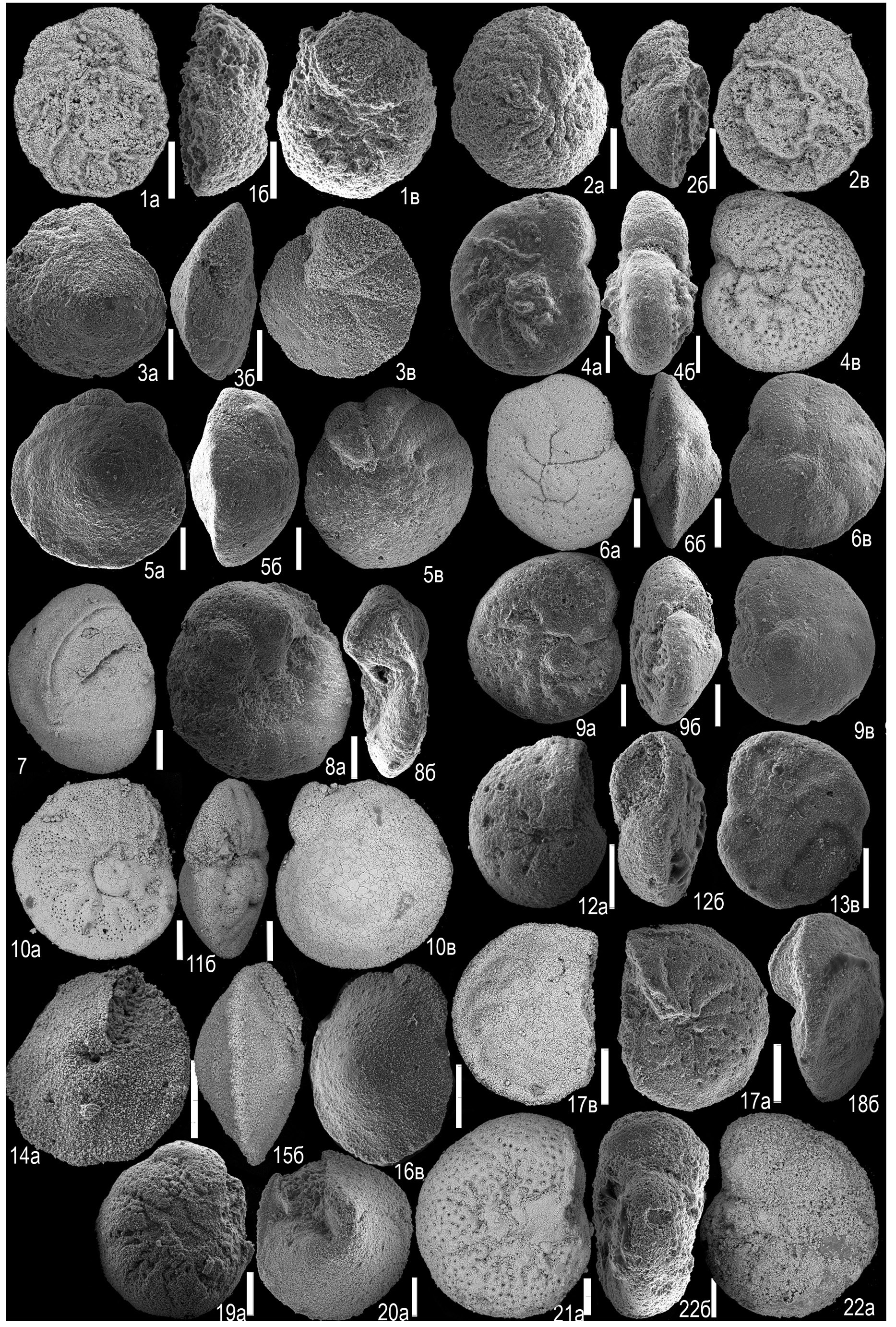 1 — Stensioeina pommerana Brotzen), обр. 3169/1, экз. SSU IPR № 263/3169-1-1; 2 — Stensioeina gracilis Brotzen, обр. 3169/1, экз. SSU IPR № 263/3169-1-2; 3 — Osangularia cordieriana (d’Orbigny), обр. 3169/1, экз. SSU IPR № 263/3169-1-4; 4 — Pseudogavelinella clementiana clementiana (d’Orbigny), обр. 3169/25, экз. SSU IPR № 263/3169–25–19; 5 — Cibicidoides aktulagayensis Vasilenko, обр. 3169/25, экз. SSU IPR № 263/3169-25-20; 6 — Cibicidoides eriksdalensis (Brotzen), обр. 3169/24, экз. SSU IPR № 263/3169-24-81; 7 — Eponides frankei Brotzen, обр. 3169/1, экз. SSU IPR № 263/3169-35-76; 8 — Gavelinella pertusa (Marsson), обр. 3169/65, экз. SSU IPR № 263/3169-65-50; 9 — Cibicides voltziana (d’Orbigny), обр. 3169/55, экз. SSU IPR № 263/3169-55-23; 10 — Brotzenella monterelensis (Marie), обр. 3169/55, экз. SSU IPR № 263/3169-55-86; 11 — Stensioeina beccariiformis (White), обр. 3169/55, экз. SSU IPR № 263/3169-55-40; 12 — Stensioeina beccariiformis (White), обр. 90, экз. SSU IPR № 263/3169-90-60; 13 — Globorotalites cf. emdyensis Vasilenko, обр. 3169/70, экз. SSU IPR № 263/3169-70-74; 14 — Globorotalites cf. emdyensis Vasilenko, обр. 3169/70, экз. SSU IPR № 263/3169–70–72; 15 — Globorotalites cf. emdyensis Vasilenko, обр. 3169/70, экз. SSU IPR № 263/3169-70-73; 16 — Angulogavelinella aff. gracilis (Marsson), обр. 3169/55, экз. SSU IPR № 263/3169-55-42; 17 — Angulogavelinella aff. gracilis (Marsson), обр. 3169/70, экз. SSU IPR № 263/3169-70-53; 18 — Stensioeina pommerana Brotzen), обр. 3169/65, экз. SSU IPR № 263/3169-65-89; 19 — Globorotalites michelinianus (d’Orbigny), обр. 3169/65, экз. SSU IPR № 263/3169-65-52; 20 — Pseudogavelinella clementiana laevigata (Marie), обр. 3169/92, экз. SSU IPR № 263/3169-92-92; 21 — Pseudogavelinella clementiana laevigata (Marie), обр. 3169/90, экз. SSU IPR № 263/3169-90-63; 22 — Pseudogavelinella clementiana laevigata (Marie), экз. SSU IPR № 263/3169-90-63. a — вид с брюшной стороны, б — вид с периферического края, в — вид со спинной стороны. Длина масштабной линейки 100 мкм