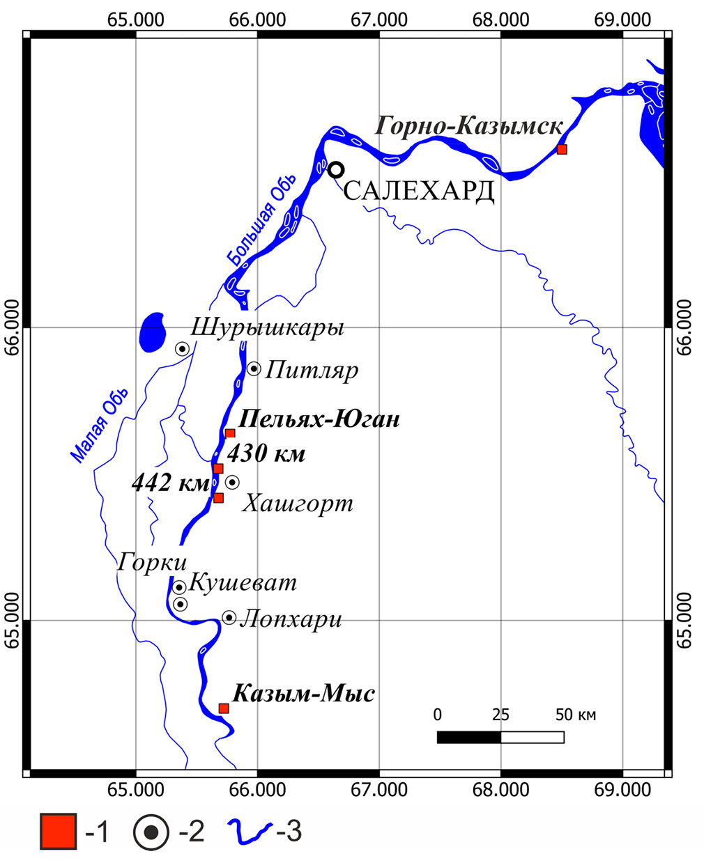 1 — местонахождения геологических разрезов (№ 1 — 430 км; № 2 — 442 км); 2 — населенные пункты; 3 — гидросеть