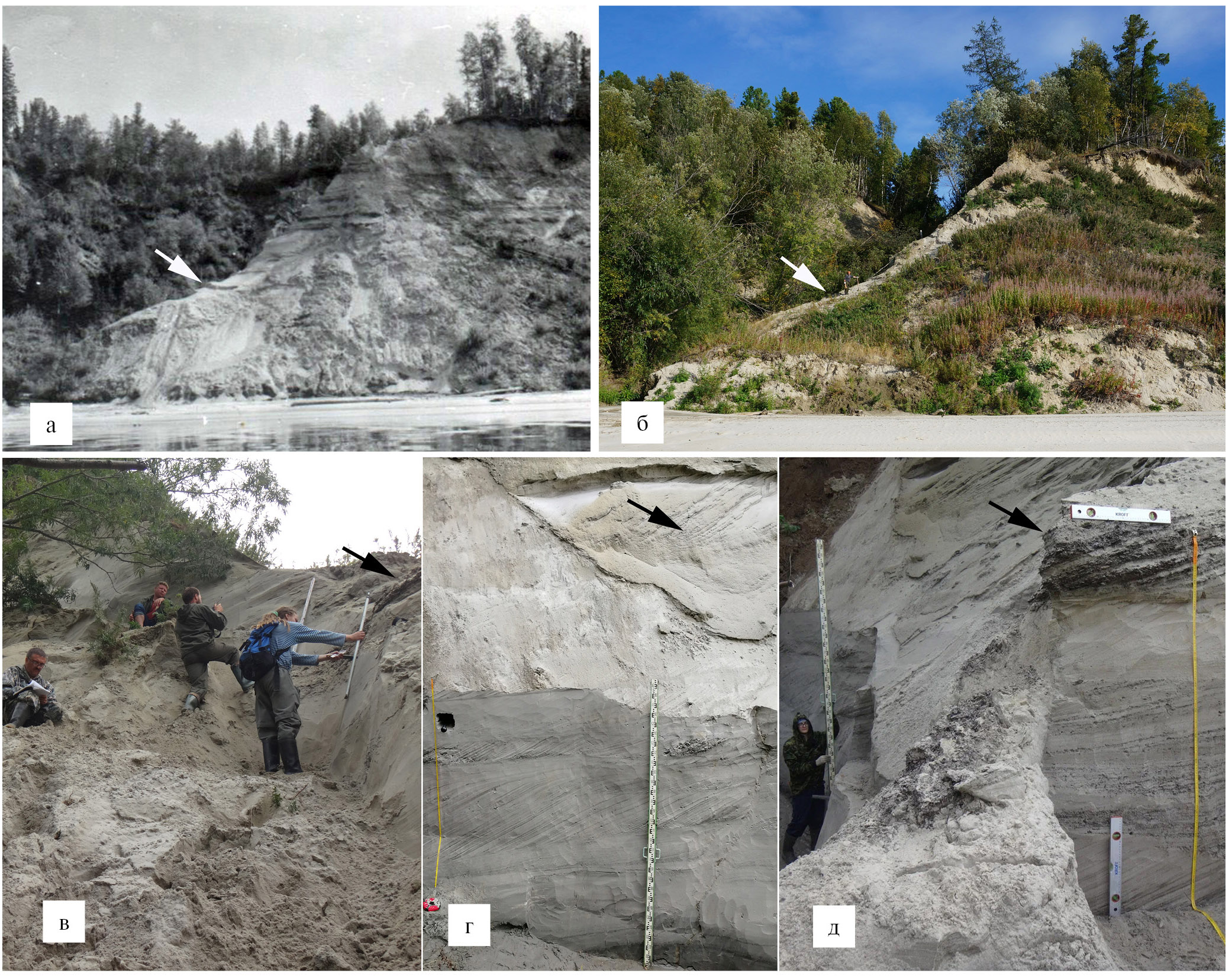 (а) — западная экспозиция правого берега Большой Оби в 1981 г.; стрелкой отмечен верх слоя, соответствующего слою 15 разреза 442 км; (б) — западная экспозиция правого берега Большой Оби в 2021 г., стрелкой отмечен верх слоя 15 разреза 442 км; (в) — процесс расчистки левого берега лога (северная экспозиция) разреза 442 км, стрелкой отмечен верх слоя 15 разреза; (г) — нижняя часть разреза 442 км, левый берег лога, северная экспозиция, стрелкой отмечен слой 15 разреза; (д) — расчистка слоев 15–18 разреза 442 км (западная экспозиция) на стыке с расчисткой левого берега лога (северная экспозиция)