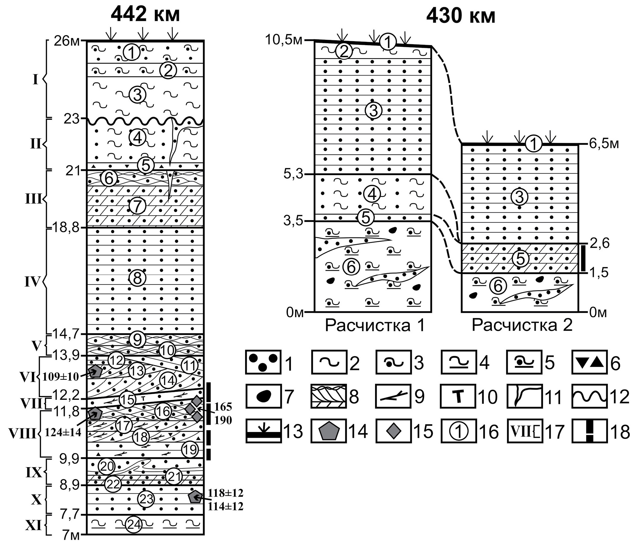 1 — песок; 2 — алеврит; 3 — алевропесок; 4 — алевропелит; 5 — пескоалевропелит; 6 — дресва; 7 — гальки, валуны; 8 — слоистость; 9 — растительный детрит; 10 — аллохтонный торф; 11 — криогенные клинья; 12 — прослой с конволюциями; 13 — современная почва; 14 — ОСЛ-даты Лаборатории оптически стимулированной люминесценции ВСЕГЕИ; 15 — ОСЛ-даты Лаборатории люминесцентного датирования Орхусского университета (Дания); 16 — номера слоев; 17 — номера пачек; 18 — места отбора териофауны