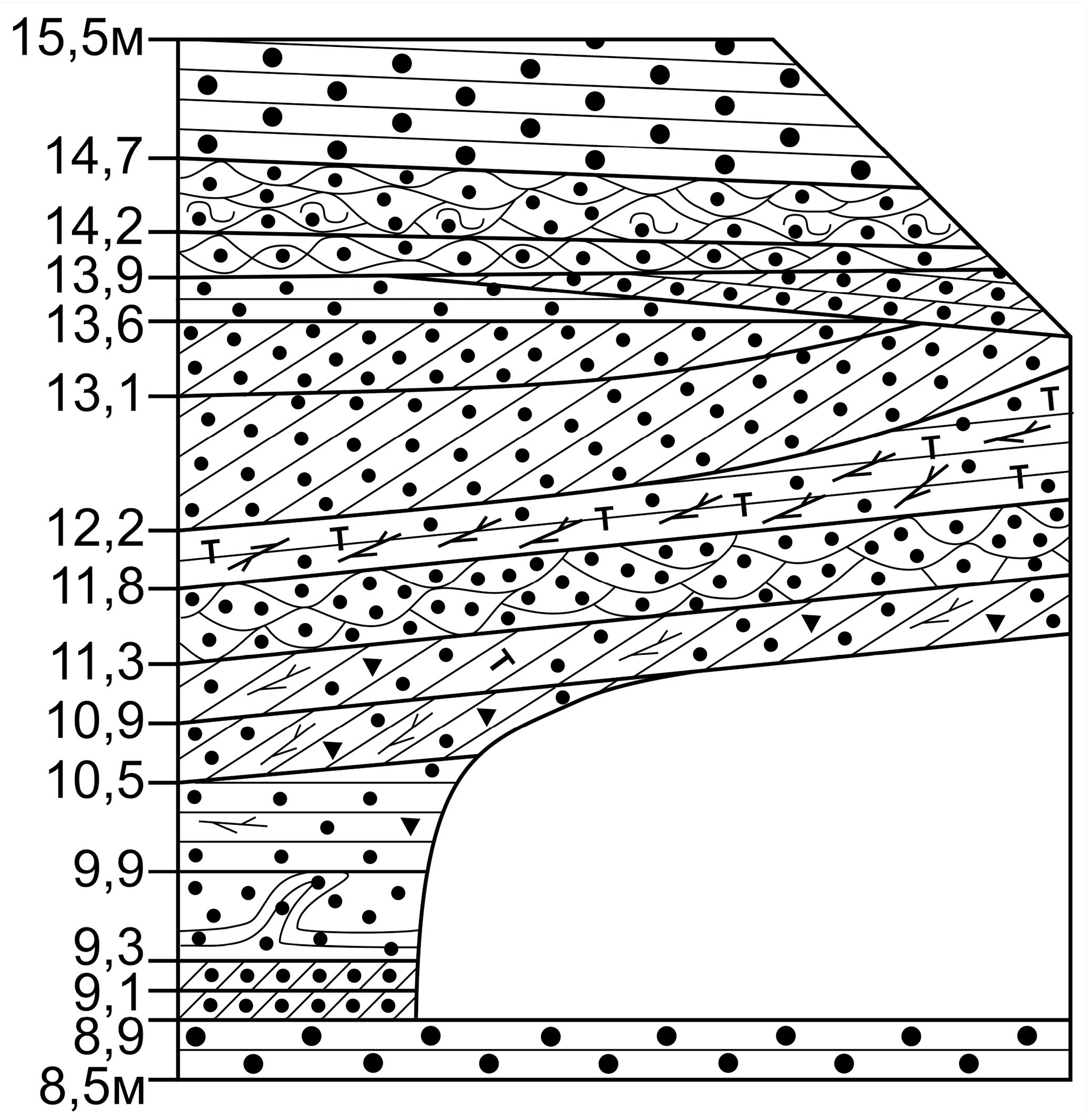 14.2–13.9 м. Слой 10. Песок светло-серый пологоволнисто-параллельно-линзовидно- косослойчатый (текстура аналогична текстуре в слое 9). Мощность 0.3 м в левом краю и 0.15 м в правом. Подошва субгоризонтальная, с угловым несогласием срезает нижележащие отложения.