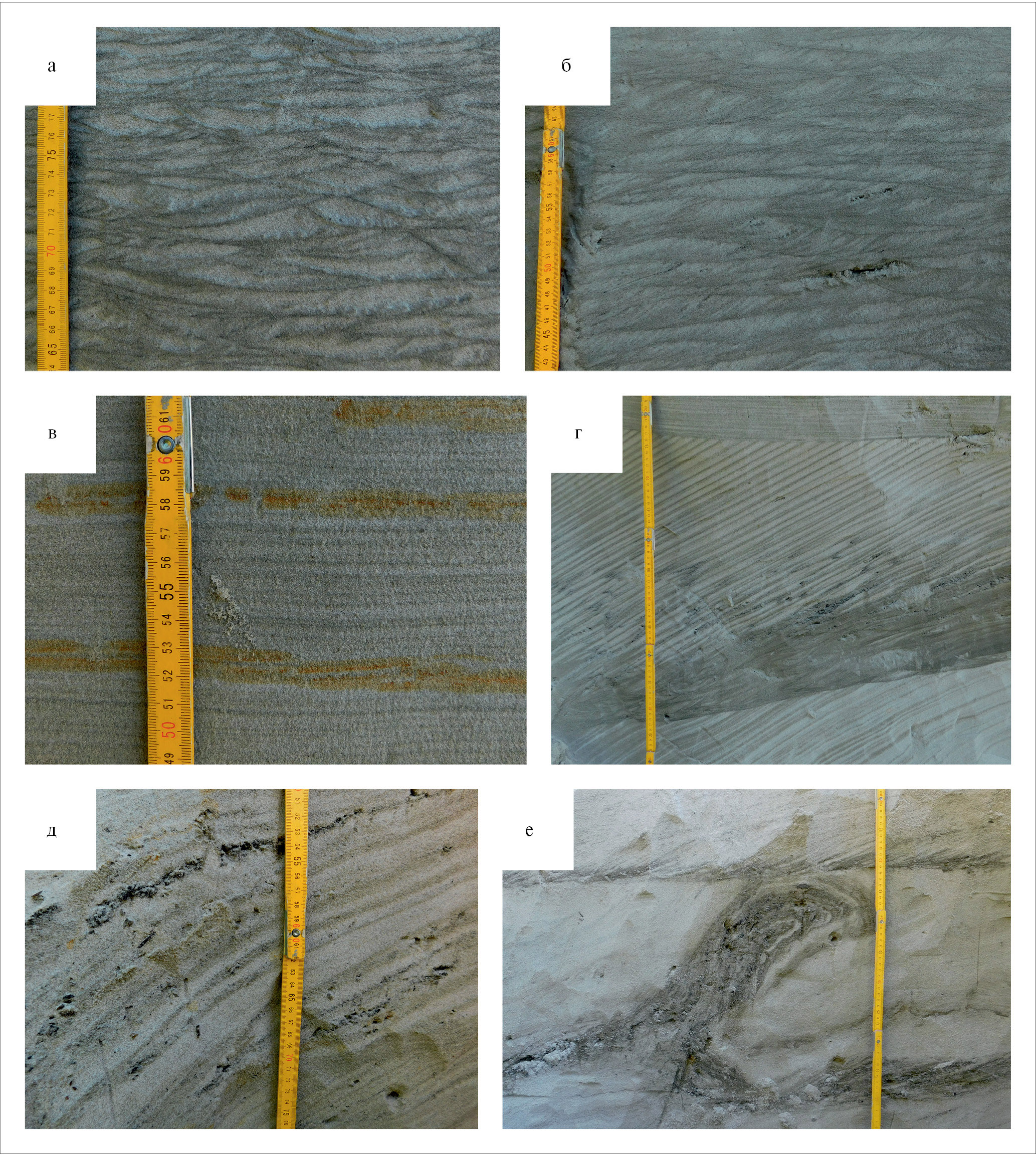 (а) — пологоволнисто-линзовидная слойчатость; (б) — плоскопараллельно-косая слойчатость; (в) — параллельная слоистость; (г) — диагональная слоистость; (д) — косая слоистость с растительным детритом; (е) — лежачая складка