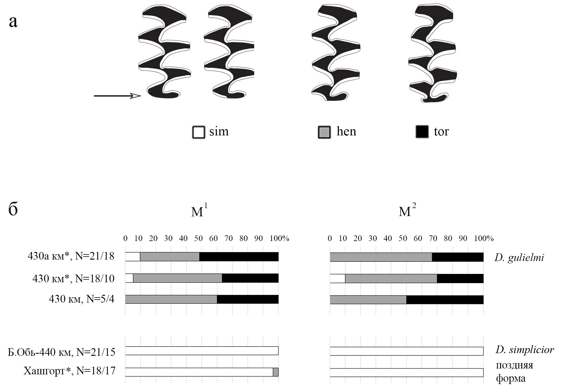 (а) — морфотипы (на примере M1), используемые для выделения хроновидов позднего (D. gulielmi) и среднего (D. simplicior) неоплейстоцена Западной Сибири (по Смирнов и др., 1997); стрелкой показан дистальный (задний) отдел зуба, где прослеживаются различия морфотипов sim, hen и tor; (б) — соотношение морфотипов М1 и М2 в выборках из местонахождений 430 и 442 км Оби; звездочкой отмечены местонахождения, изученные в 1980-х гг. (Смирнов и др., 1986), остальные изучены в 2016–2022 гг.; N — число целых и поврежденных зубов (M1/M2) c идентифицируемыми морфотипическими характеристиками
