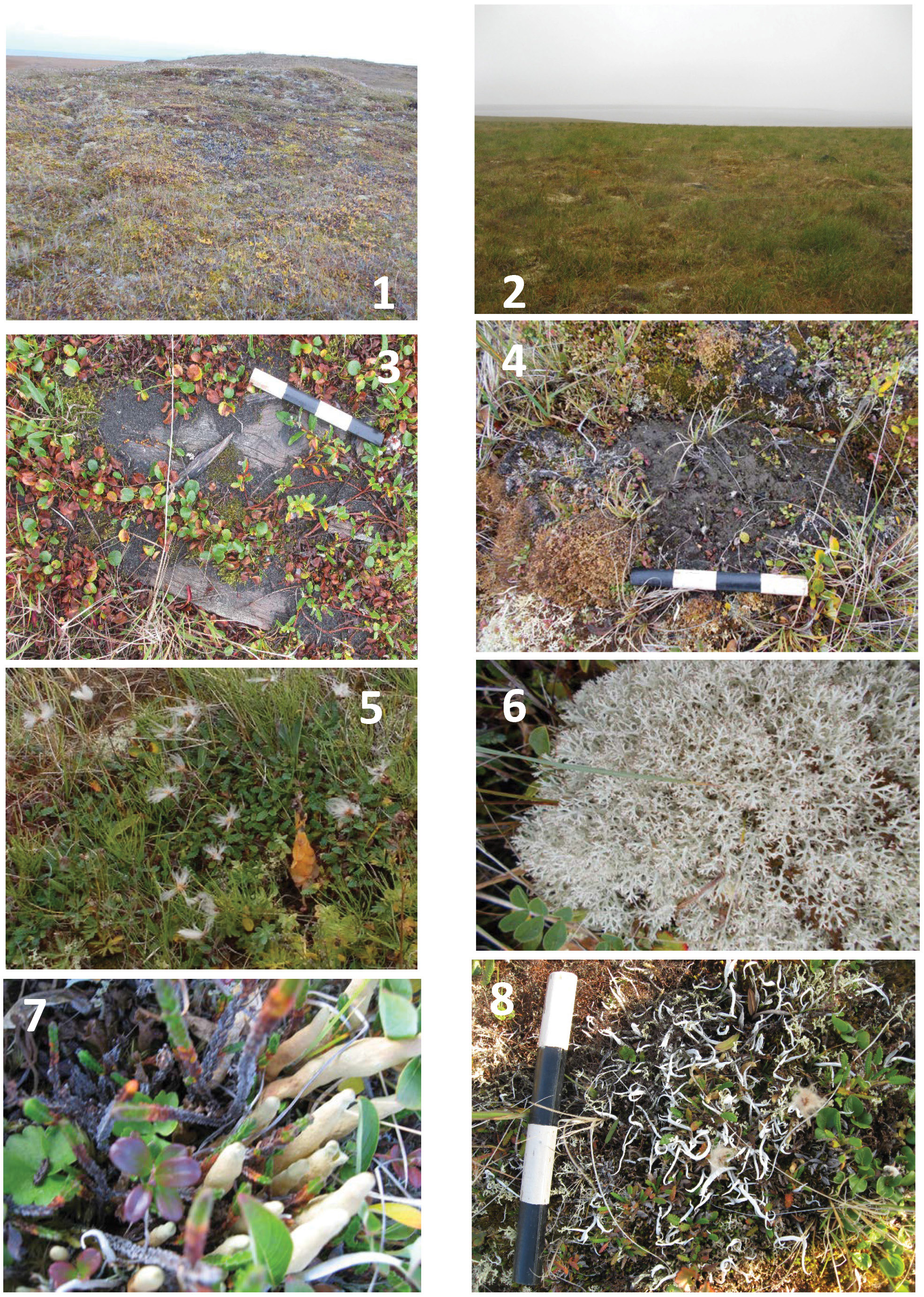 1 – ландшафт точки 1; 2 – ландшафт точки 2; 3 – точка отбора материала с остатков лагеря; 4 – точка отбора грунта с пятна-медальона; 5 – Dryas punctata Juz в точке 1; 6 – Cladonia rangiferina (L.) Web. в точке 1; 7 – Dactylina arctica (Hock.) Nуl. в точке 1; 8 – Сladonia cоrnuta (L.) Hoffm. в точке 1. Длина масштабной линейки 5 см для фиг. 3, 4, 8