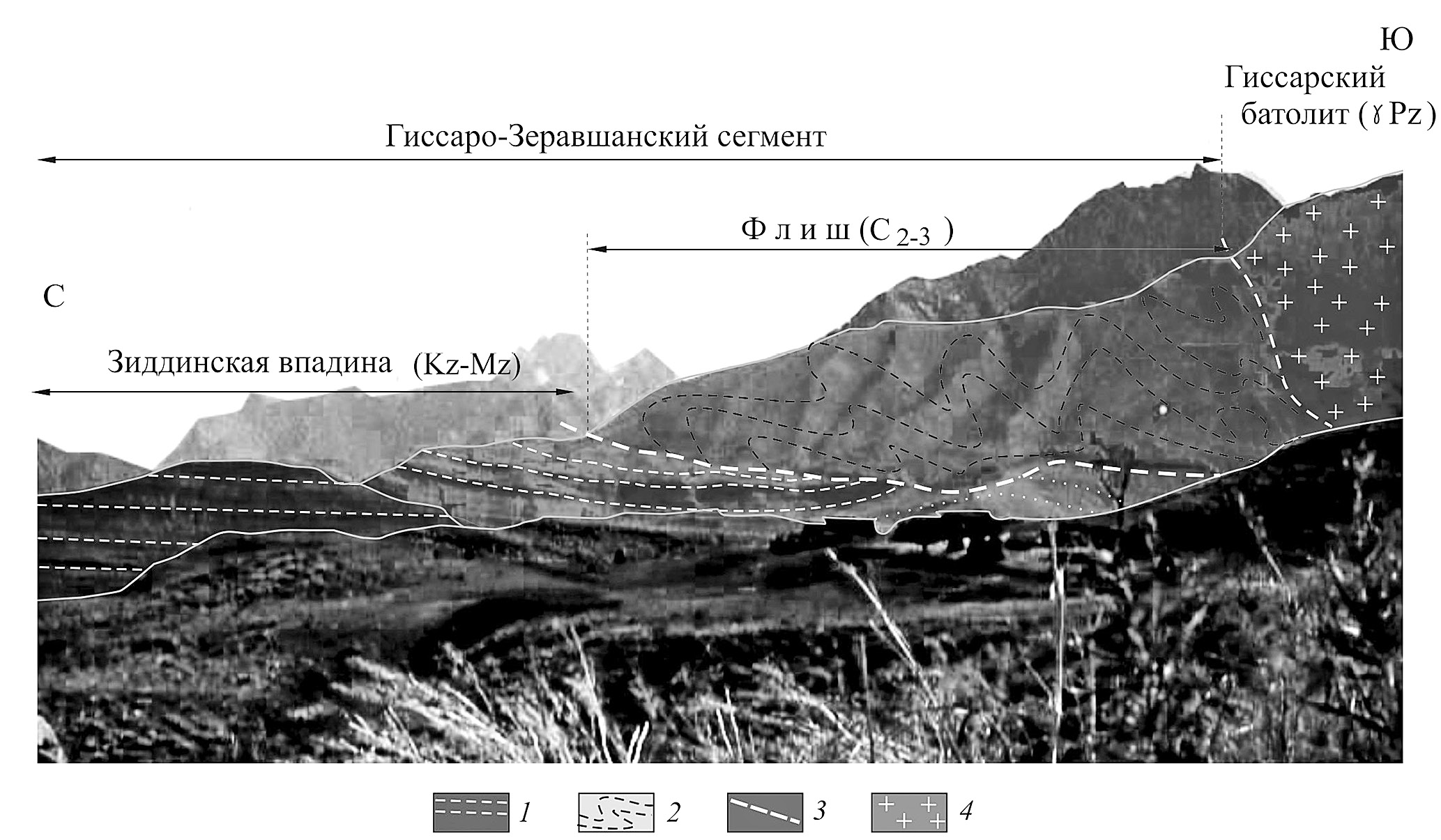 Южно-Гиссарская (она же Османталинская) зона занимает южный склон Гиссарского и, частично, Каратегинского хребтов (рис. 3). Южным ограничением зоны является Южно-Гиссарский разлом, северным – Северо-Гиссарский разлом. К зоне Северо-Гиссарского разлома приурочен среднекаменноугольный полифазный гранитный Гиссарский батолит. Этот батолит и зона Северо-Гиссарского разлома, по существу, являются пограничными структурами между Гиссаро-Зеравшанским и Гиссарским тектоническими сегментами (или зонами) Южного Тянь-Шаня (рис. 3). Являясь в совокупности порождением герцинского этапа, эти сегменты отличаются один от другого по месту и времени как начала тектогенеза (заложение прогибов), так и его окончания и относительной консолидации горных масс. Зона краевого Южно-Гиссарского шва и территория к северу от него характеризуются сложным сочетанием терригенных, карбонатных и вулканических пород разного состава. Вулканиты, по (Ковальчук, 1984), с одной стороны, родственны спилитам и альбитофирам коры океанического типа, а с другой – липаритам и кварцевым порфирам срединных массивов (микроконтинентов).