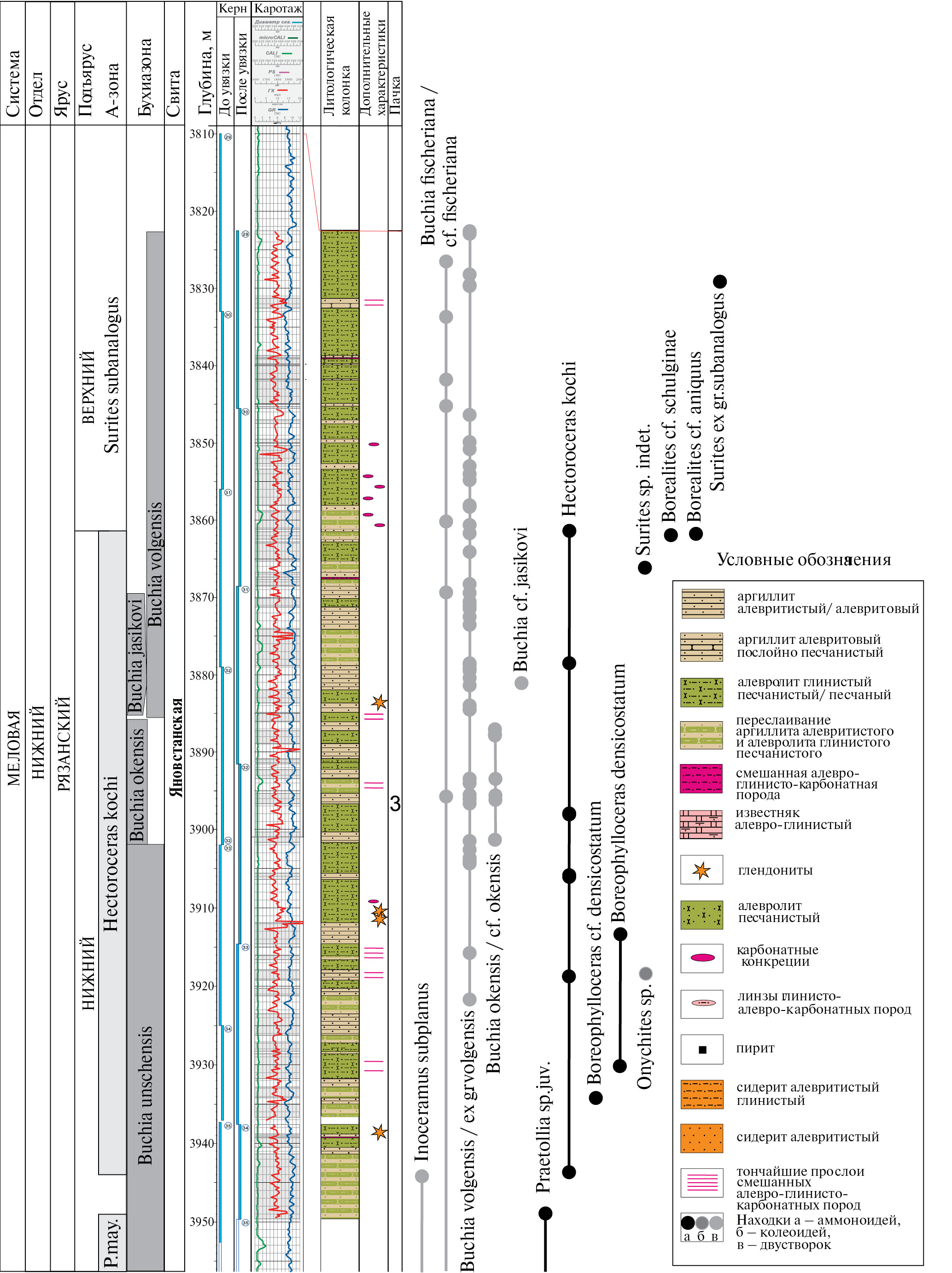 Зона Craspedites okensis (гл. 3979.43 м). Верхневолжский подъярус имеет резко сокращенную мощность (интервал между последними находками средневолжских аммонитов и первыми находками рязанских видов составляет около 6 м), но при этом признаков перерыва или конденсации в разрезе не видно, а находки окаменелостей здесь единичны. Был встречен один единственный аммонит Craspedites (C.) cf. schulgnae Alifirov (табл. IV, фиг. 4), распространенный в верхневолжском подъярусе Сибири (Алифиров, 2009). Находки этого вида в средневолжском подъярусе скв. Хальмерпаютинская 2099 (Алифиров, 2009), на наш взгляд, неверно датированы, так же как и встреченные выше мелкие аммониты, близкие к Praetollia и первоначально определенные как Laugeites (Алифиров, Игольников, 2007, табл., фиг. 8). У этих экземпляров очень узкий умбиликус, совершенно не характерный для Laugeites, и они неотличимы от ювенильных Praetollia из Восточной Гренландии (Spath, 1952, pl. II, fig. 1; Surlyk, 1978, pl. 5, figs. 1–4). Скорее всего, верхневолжский подъярус представлен в скв. Новоякимовская-1 в неполном объеме. Хотя его небольшая мощность по сравнению со средневолжским и нижнерязанским подъярусами характерна для многих разрезов Западной Сибири (Панченко и др., 2015, 2021; Эдер и др., 2022), эти различия не столь велики, как в изученной скважине. В расположенных восточнее разрезах ЕХРП верхневолжский подъярус иногда достигает существенной мощности (более 40 м), сопоставимой с таковой нижнерязанского интервала (Опорный…, 1969).