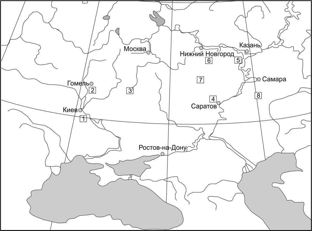 1 – Григоровка и Костянецкий яр (Каневские дислокации, ДДВ); 2 – скв. 792 (Гомельский р-н, Белоруссия); 3 – Михайловский карьер (Курская обл.); 4 – Бартоломеевка и ТЭЦ-5 (Саратовская обл.); 5 – Тархановская пристань (Тетюшский р-н, Татарстан); 6 – Починки (Нижегородская обл.); 7 – скв. 6 (Обвал) (Тамалинский р-н, Пензенская обл.); 8 – скв. 103 и 108 (Перелюбский р-н, Саратовская обл.).
