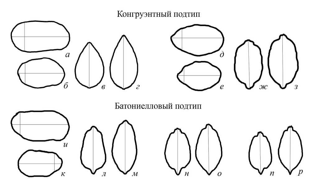 а–з – конгруэнтный подтип: а–г – Acanthocythere spaerulata (Jones et Sherborn): а, г – голотип BMNH no. I.1835, ЦР самца (0.51) из бата Южной Англии (по: Sylvester-Bradley, 1956, pl. 1, fig. 1): а – справа, г – со спинной стороны; б, в – из верхнего бата Северной Франции (по: Sheppard, 1981, pl. 15, figs. 1, 2): б – экз. OS11502, ПС самки (0.62), в – экз. OS11791, ЦР самки (0.59) со спинной стороны; д–з – Glyptocythere tuberosa Brand et Malz in Brand et Fahrion из верхнего байоса Северной Германии (по: Brand, Malz, 1966, pl. 57, figs. 61, 63, 66, 67): д – экз. Xe 4377, ПС самца (0.69), е – экз. Xe 4376, ПС самки (0.60), ж – экз. Xe 4376, ЦР самки (0.60) со спинной стороны, з – экз. Xe 4377, ЦР самца (0.69) со спинной стороны; и–р – батониелловый подтип: и–м – Parabathoniella elongata (Wakefield) из нижнего бата Шотландии (по: Wakefield, 1994, pl. 4, figs. 4–6, 9): и, м – голотип OS13816, ЦР самца (0.89): и – справа, м – со спинной стороны; к, л – экз. OS13824, ЦР самки (0.85): к – слева, л – со спинной стороны; н, о – Bathoniella milanovskyi (Lyub.): н – экз. МГУ КЯ-58, ЦР самки со спинной стороны (табл. II, фиг. 18), о – экз. МГУ КЯ-57 ЦР самца со спинной стороны (табл. II, фиг. 19); п, р – B. paenultima sp. nov.: п – экз. МГУ Poch-094, ЦР самки со спинной стороны (табл. III, фиг. 17), р – экз. МГУ Poch-190, ЦР самца со спинной стороны (табл. III, фиг. 19).