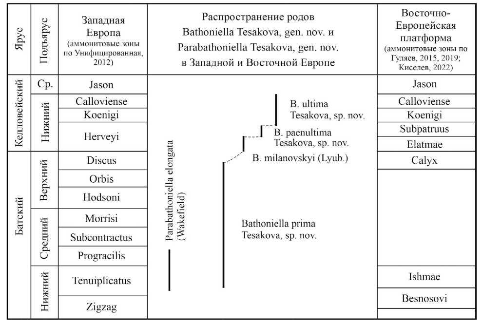 К моноспецифическому роду Parabathoniella Tesakova, gen. nov. отнесен B. elongata (Wakefield, 1994) из верхней части нижнего–среднего бата Внутренних Гебрид, Шотландия (условно зоны Tenuiplicatus–Progracilis).