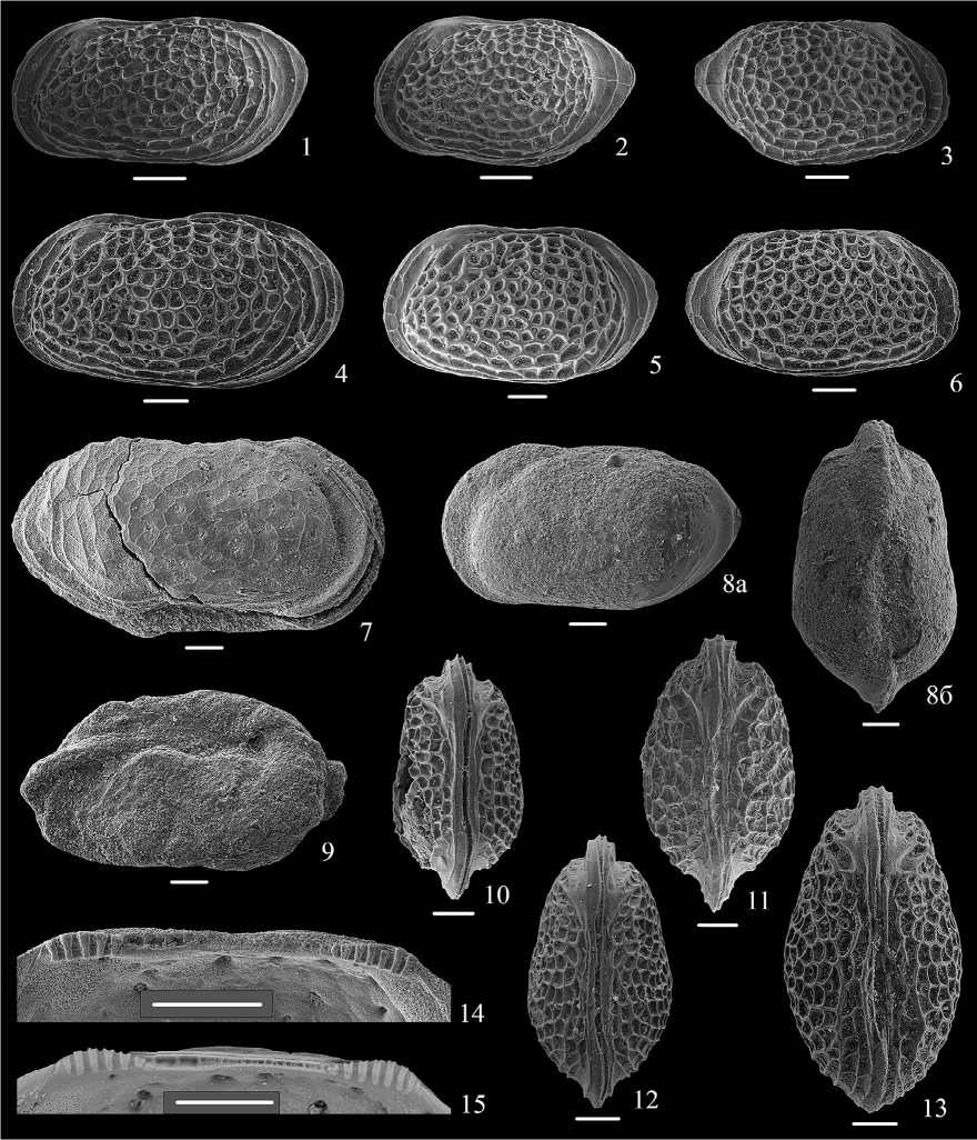 Остракоды сфотографированы на сканирующем электронном микроскопе (СЭМ) TESCAN VEGA-II XMU и VEGA-III XMU в кабинете приборной аналитики Палеонтологического института им. А.А. Борисяка РАН, а их изображения представлены на фототаблицах (табл. I–IV).