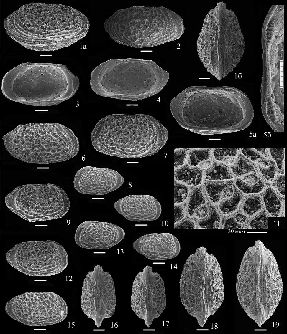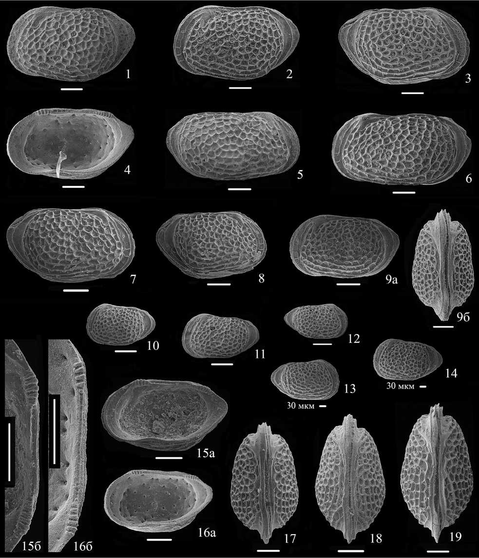1–19 – Bathoniella milanovskyi (Lyub.): 1 – экз. МГУ КЯ-55а, ЦР самца: а – с брюшной стороны, б – со спинной стороны; 2 – экз. МГУ Grig-1-162, ПС самца; 3 – экз. МГУ Bart-31, ПС самки изнутри; 4 – экз. МГУ КЯ-55, ПС самки изнутри; 5 – экз. МГУ ТП-011, ЛС самки: а – изнутри, б – замок; 6 – экз. МГУ КЯ-65, ПС juv. А1–А2; 7 – экз. МГУ КЯ-63, ЛС самки; 8 – экз. МГУ КЯ-77, ЛС juv. А5–А6; 9 – экз. МГУ КЯ-59, ЦР juv. А3–А4 справа; 10 – экз. МГУ КЯ-74, ПС juv. А5–А6; 11 – экз. МГУ Bart-30, ПС самки, ситовидные поры; 12 – экз. МГУ КЯ-61, ЦР juv. А3–А4 справа; 13 – экз. МГУ КЯ-79, ЛС juv. А5–А6; 14 – экз. МГУ КЯ-70, ПС juv. А5–А6; 15 – экз. МГУ КЯ-68, ПС juv. А3–А4; 16 – экз. МГУ КЯ-60-a, ЦР juv. А3–А4 со спинной стороны; 17 – экз. МГУ КЯ-61-b, ЦР juv. А3–А4 со спинной стороны; 18 – экз. МГУ КЯ-58, ЦР самки со спинной стороны; 19 – экз. МГУ КЯ-57, ЦР самца со спинной стороны.