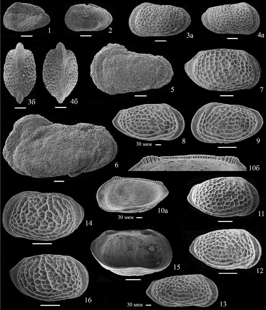 1–6 – Bathoniella prima Tesakova, sp. nov.: 1 – экз. МГУ Perelub-67, ЦР juv. A7?, гл. 175.0 м, верхний бат; 2 – экз. МГУ Perelub-69, ЦР juv. A7?, гл. 175.0 м, верхний бат; 3 – экз. МГУ Perelub-66, ЦР juv. A5–A6, гл. 201.5 м: а – слева, б – со спинной стороны; 4 – экз. МГУ Perelub-54, ЦР juv. A5–A6, гл. 201.5 м: а – справа, б – со спинной стороны; 5 – экз. МГУ Perelub-42, ядро ЦР juv. A3–A4 слева, гл. 197.7 м; 6 – экз. МГУ Perelub-38, ядро ЦР самца слева, гл. 197.7 м; фиг. 7 – Bathoniella milanovskyi (Lyubimova), экз. МГУ Pnz-3-44, ПС juv. А1–А2, Тамалинский р-н, Пензенская обл., скв. 6 (Обвал), гл. 349.0–350.5 м, бат; 8–13 – Bathoniella ultima Tesakova, sp. nov.: 8 – экз. МГУ Belor-1–17, ПС самки; 9 – голотип МГУ Belor-1-15, ЛС самки; 10 – экз. МГУ Belor-1-18, ПС самки: а – изнутри, б – замок; 11 – экз. МГУ 300-4638, ПС самки; 12 – экз. МГУ 300-16, ПС самки; 13 – экз. МГУ Belor-1-16, ПС juv?; 14–16 – Glyptocythere tuberosa (Khabarova): 14 – экз. МГУ Sokur-Ya-178, ЛС самки (Д – 0.415 мм, ВПК – 0.238 мм, Вmax – 0.242 мм, ВЗК – 0.212 мм), гл. 38.6 м; 15 – экз. МГУ Sokur-Ya-180, ЛС самки изнутри (Д – 0.544 мм, ВПК – 0.275 мм, Вmax – 0.3 мм, ВЗК – 0.241 мм), гл. 12.5 м; 16 – экз. МГУ Sokur-Ya-177, ПС самки (Д – 0.403 мм, ВПК – 0.214 мм, Вmax – 0.232 мм, ВЗК – 0.172 мм), гл. 16.4 м.