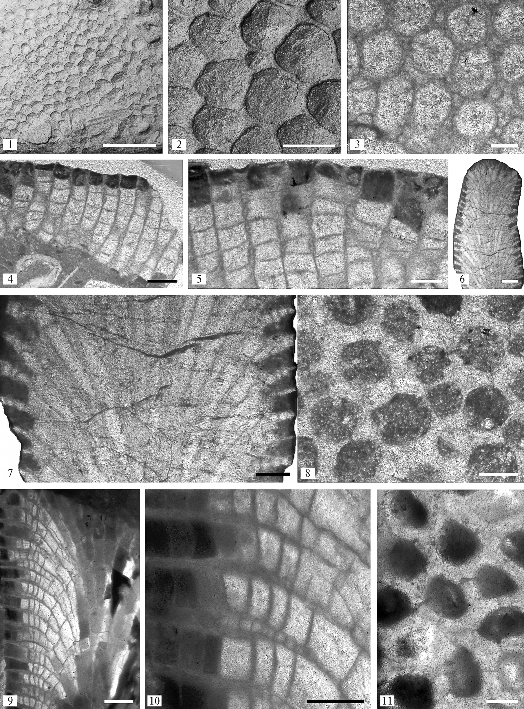1–5 – Stigmatella convestens Astrova in Ivanova et al., экз. ПИН, № 5846/6; 6–8 – Stigmatella sp., экз. ПИН, № 5846/7; 9–11 – Batostoma varians (James), экз. ПИН, № 5846/8. Длина масштабной линейки 1 мм для фиг. 1, 6, 9; 750 для фиг. 4; 500 мкм для фиг. 2, 5, 7, 10; 250 мкм для фиг. 3, 8, 11.