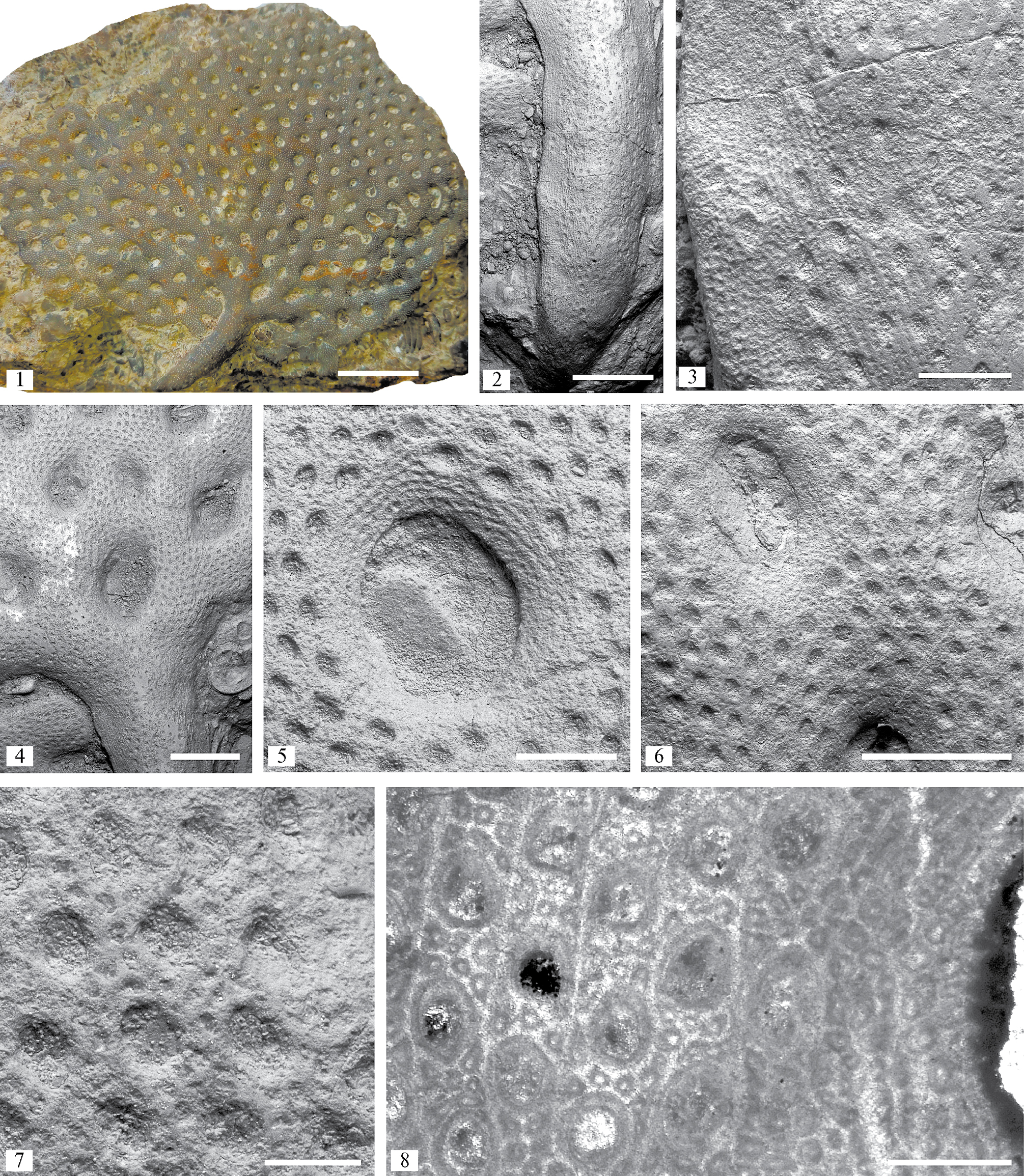 1–8 – Phaenoporella multipora Nekhoroshev, экз. ПИН, № 5846/24. Длина масштабной линейки 1 см для фиг. 1; 2 мм для фиг. 2, 4; 1 мм для фиг. 6; 500 мкм для фиг. 3, 5; 250 мкм для фиг. 8); 200 мкм для фиг. 7.