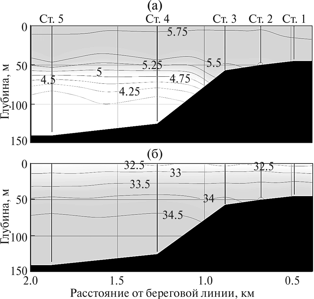 Наибольшие градиенты изменения солености обнаружены в слое 0–5 м, где наблюдались самые низкие значения – от 30 до 32.8 епс. Понижение солености обусловлено влиянием речного стока. В более глубоких слоях воды соленость повышается до 34.89 епс. На глубоководных точках отбора в слое от 75 м до дна изменения солености незначительны, от 34.50 до 34.89 епс.