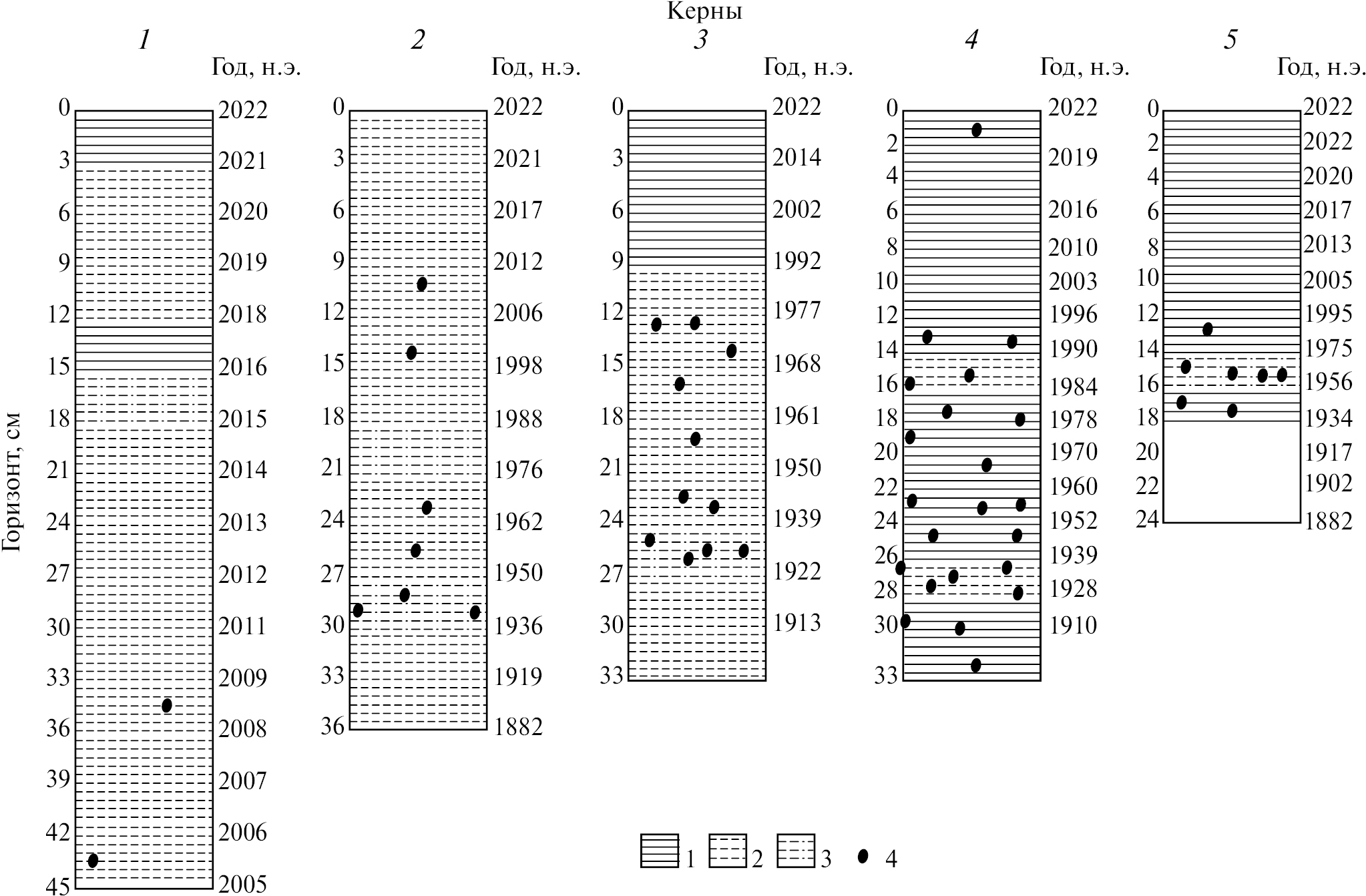 Рис. 3. Стратиграфия и хронология формирования литотипов донных отложений на устьевом взморье реки Грёндален (керны 1–5). 1 – глинистый ил; 2 – ил; 3 – песчанистый ил; 4 – зерна гравия (1 символ – 5% от гранулометрического состава горизонта).