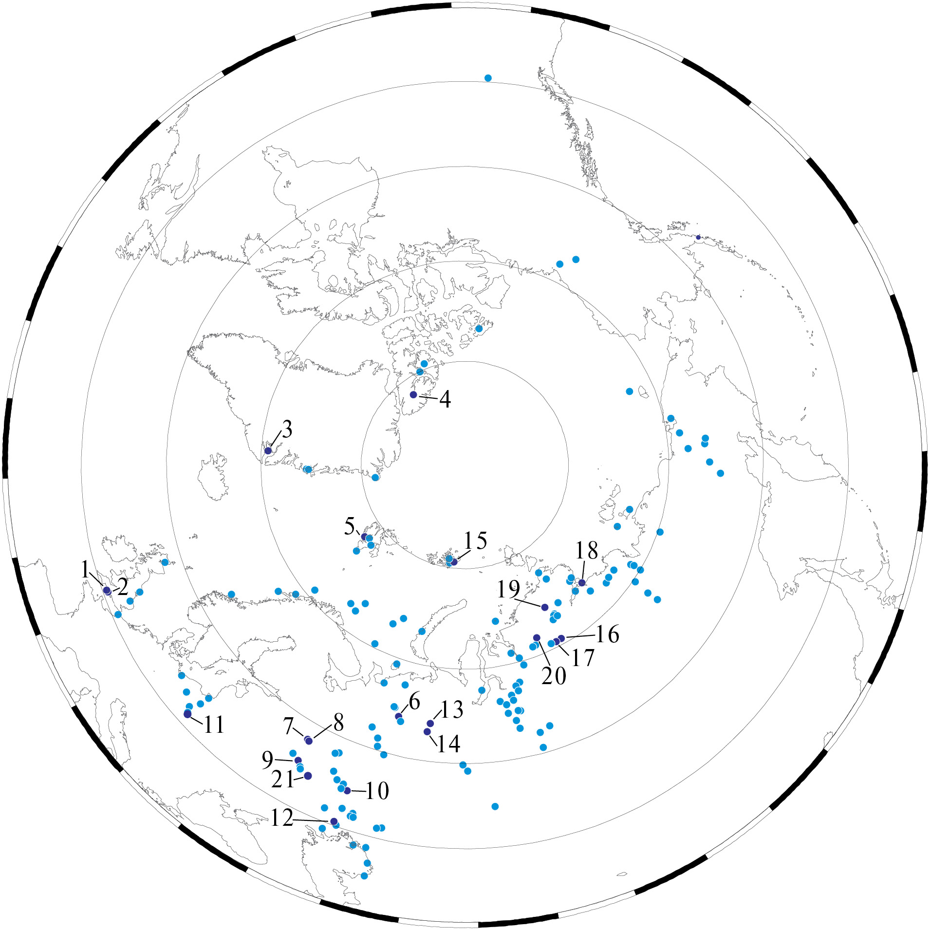 Цифрами обозначены разрезы, имеющие особое значение для разработки зональных шкал разных регионов: 1 – о-в Портленд (стратотип портландского яруса); 2 – Кимериджская бухта (стратотип кимериджского яруса); 3 – Земля Милна; 4 – Роллрок, о-в Элсмир; 5 – м. Фестнинген, Шпицберген; 6 – р. Ижма; 7 – Глебово; 8 – Васильевское; 9 – Карьеры Лопатинского фосфоритного рудника (дополнительный разрез средне- и верхневолжского подъярусов); 10 – Городищи (лектостратотип волжского яруса); 11 – Овадов-Бжезинки; 12 – Бердянка (дополнительный разрез нижневолжского подъяруса); 13 – р. Ятрия; 14 – р. Маурынья; 15 – м. Ламон, о-в Земля Вильчека; 16 – р. Левая Боярка; 17 – р. Хета; 18 – м. Урдюк-Хая, п-в Нордвик; 19 – р. Дябяка-Тари; 20 – скв. Новоякимовская 1; 21 – Никитино–Шатрищи (опорные разрезы рязанского яруса типового региона).
