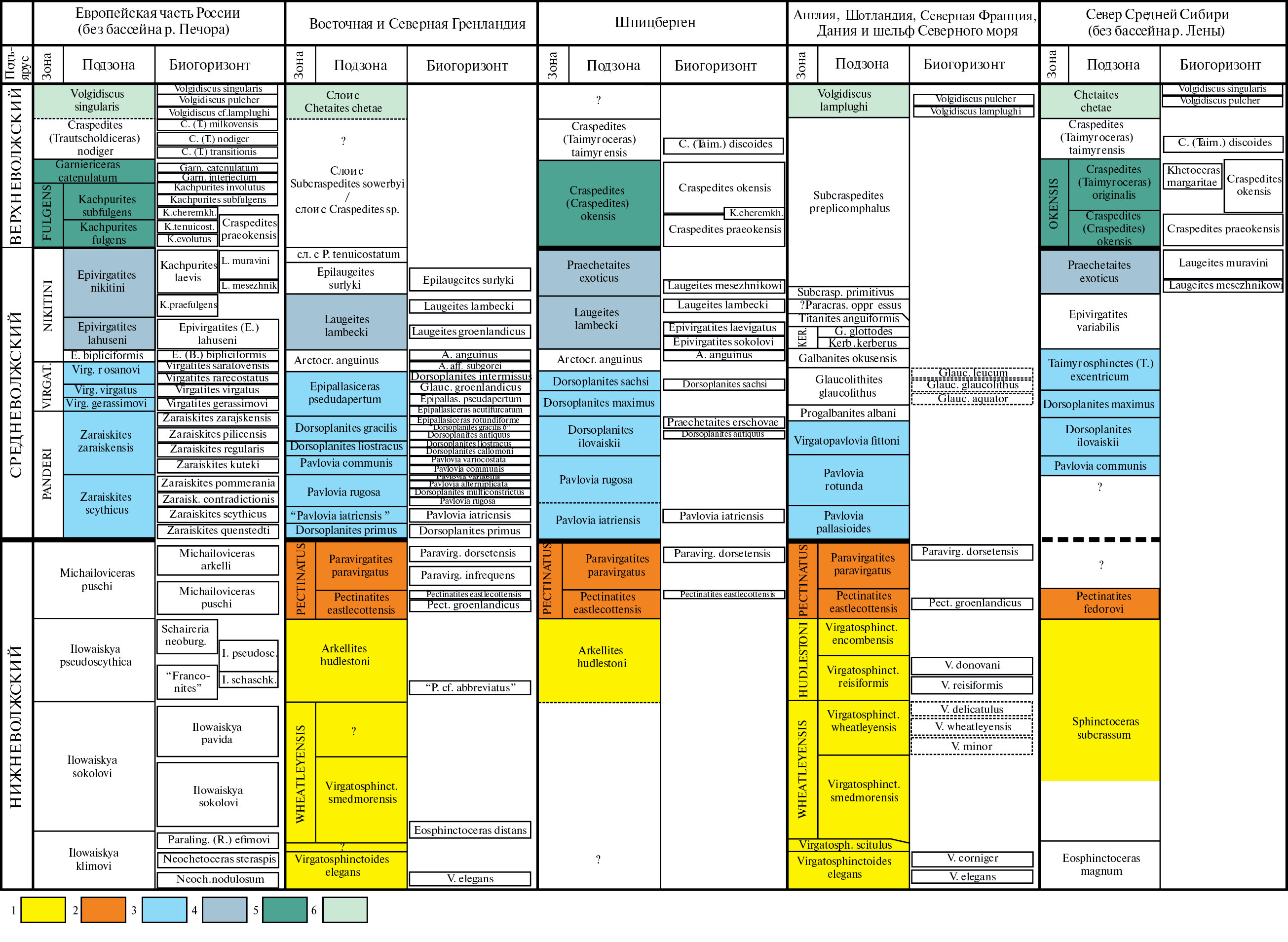 Одинаковым цветом обозначены интервалы распространения ключевых родов и подродов аммонитов, наиболее значимых для внутрибореальной корреляции: 1 – Virgatosphinctoides; 2 – Pectinatites + Paravirgatites; 3 – Pavlovia + Dorsoplanites; 4 – Laugeites; 5 – Craspedites (Craspedites); 6 – Volgidiscus + Chetaites.