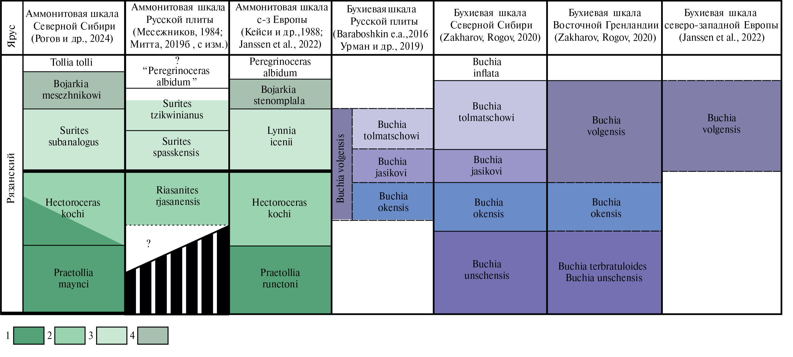 В отличие от зональных шкал волжского яруса, демонстрирующих очень высокое разнообразие (что вызвано высокой степенью биогеографической дифференциации фаун), для рязанского яруса всей Арктики (рис. 3) может быть использована шкала, первоначально разработанная на разрезах севера Сибири (Сакс, Шульгина, 1962, 1964, 1969; Алексеев, 1984). Существенно отличающиеся шкалы (рис. 3) разработаны только для Северо-Западной Европы (Casey, 1973), где, несмотря на различия видов-индексов, принципиальная последовательность зон близка к таковой Арктической шкалы, а также для типового региона (Восточно-Европейская платформа; Рогов и др., 2015; Mitta, 2017; Митта, 2019a, 2019б, 2021), где шкала в значительной степени основана на аммонитах тетического происхождения (Himalayitidae), хотя во всем рязанском ярусе встречаются бореальные аммониты, относящиеся к широко распространенным в Арктике родам (Митта, 2019а, 2019б). Степень детальности расчленения рязанских отложений отстает от таковой для волжского яруса: в рязанском ярусе преимущественно используются только зоны, без более дробных стратонов (Casey, 1973; Игольников, 2019; Митта, 2021). Это связано как с меньшей изученностью рязанских отложений и аммонитовых фаун по сравнению с волжскими, так и, видимо, с меньшей продолжительностью рязанского века. В европейской части России дополнительным неблагоприятным фактором, препятствующим дальнейшей детализации шкалы по аммонитам, является небольшая мощность отложений, обилие перерывов и горизонтов конденсации. Поэтому, несмотря на многочисленные новые данные, появившиеся в последние 20 лет, главным образом благодаря исследованиям В.В. Митта (обобщены в Mitta, 2017; Митта, 2019a, 2019б, 2021), зональная шкала за это время осталась без особых изменений, а предлагавшиеся инфразональные подразделения (Митта, 2007) в дальнейшем не использовались.