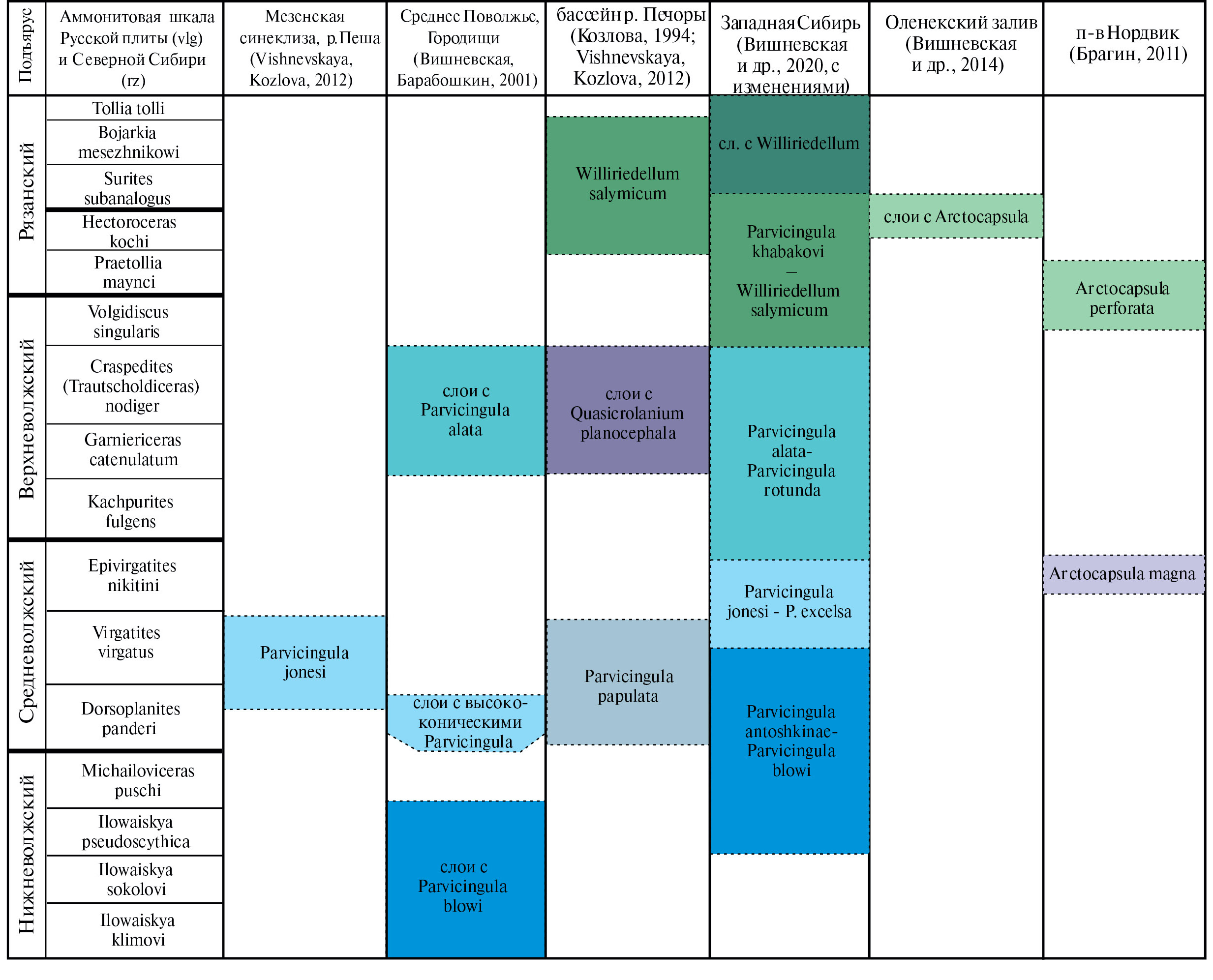 В Арктической области России современная радиоляриевая схема расчленения волжских отложений предложена только для баженовской свиты Западно-Сибирской нефтегазоносной провинции (Вишневская и др., 2020). В основании баженовской свиты выделяется зона Parvicingula antoshkinae–P. blowi (нижний подъярус волжского яруса–низы среднего подъяруса волжского яруса), виды-индексы которой представлены высококоническими циртоидными Nassellaria с большим числом камер. В зональном комплексе присутствуют все морфологические группы радиолярий (Амон и др., 2022). Слои с P. blowi могут быть установлены в разрезе Городищи в пределах нижневолжских аммонитовых зон от Klimovi до Pseudoscythica по массовым находкам вида-индекса (Вишневская, Барабошкин, 2001). Вышеследующая в баженовской свите средневолжская зона Parvicingula jonesi–P. excelsa представляет значительный интерес благодаря тому, что к этому интервалу разреза, сложенному керогено-кремнистыми породами, приурочены максимальные нефтепроявления (Калмыков, Балушкина, 2017). Виды-индексы относятся к таксонам с наибольшим числом камер и хорошо диагностируются как в СЭМ, так и в оптическом световом микроскопе (Вишневская и др., 2020). Возраст зоны подтвержден находками Epivirgatites cf. laevigatus Rogov в стратотипе, а также единичных аммонитов зон Groenlandicus, Vogulicus и Exoticus в верхах зоны других разрезов (Брадучан и др., 1984; Панченко и др., 2015). Интервалу этой зоны, возможно, частично отвечают средневолжские слои с Parvicingula papulata в Баренцевоморско-Печорской области, слои с Parvicingula jonesi из аммонитовых зон Panderi−Virgatus бассейна р. Мезень (Vishnevskaya, Kozlova, 2012), а в разрезе Городищи – слои с высококоническими Parvicingula, составляющими более 50% от состава комплекса, из сланценосной толщи аммонитовой зоны Panderi (Вишневская, Барабошкин, 2001). Выделять верхневолжскую зону Parvicingula rotunda–P. alata позволяет первое появление зонального вида Parvicingula alata Kozlova et Vishnevskaya, 2012 и акме P. rotunda (Hull, 1977), последний вид-индекс хорошо определяется в СЭМ и по рентгеновской микротомографии (Вишневская и др., 2020). В поздневолжское время отмечается общее уменьшение высоты раковин циртоидей и полное исчезновение высококонических форм радиолярий. Зона Parvicingula rotunda–P. alata подтверждена находками аммонитов зоны Chetae в разрезах Широтного Приобья (Панченко и др., 2015) и может быть прослежена в Поволжье, где близкий комплекс установлен в аммонитовых зонах Catenulatum–Nodiger (рис. 5). Зона Parvicingula rotunda–P. alata в Западной Сибири часто отделяется от зоны P. jonesi–P. excelsa маломощным микропрослоем с переотложением карбонатного материала, детрита бухий, битой ракушки призматических слоев иноцерамов. В низах зоны выделяется несколько туфогенных прослоев (Панченко и др., 2021, 2022).
