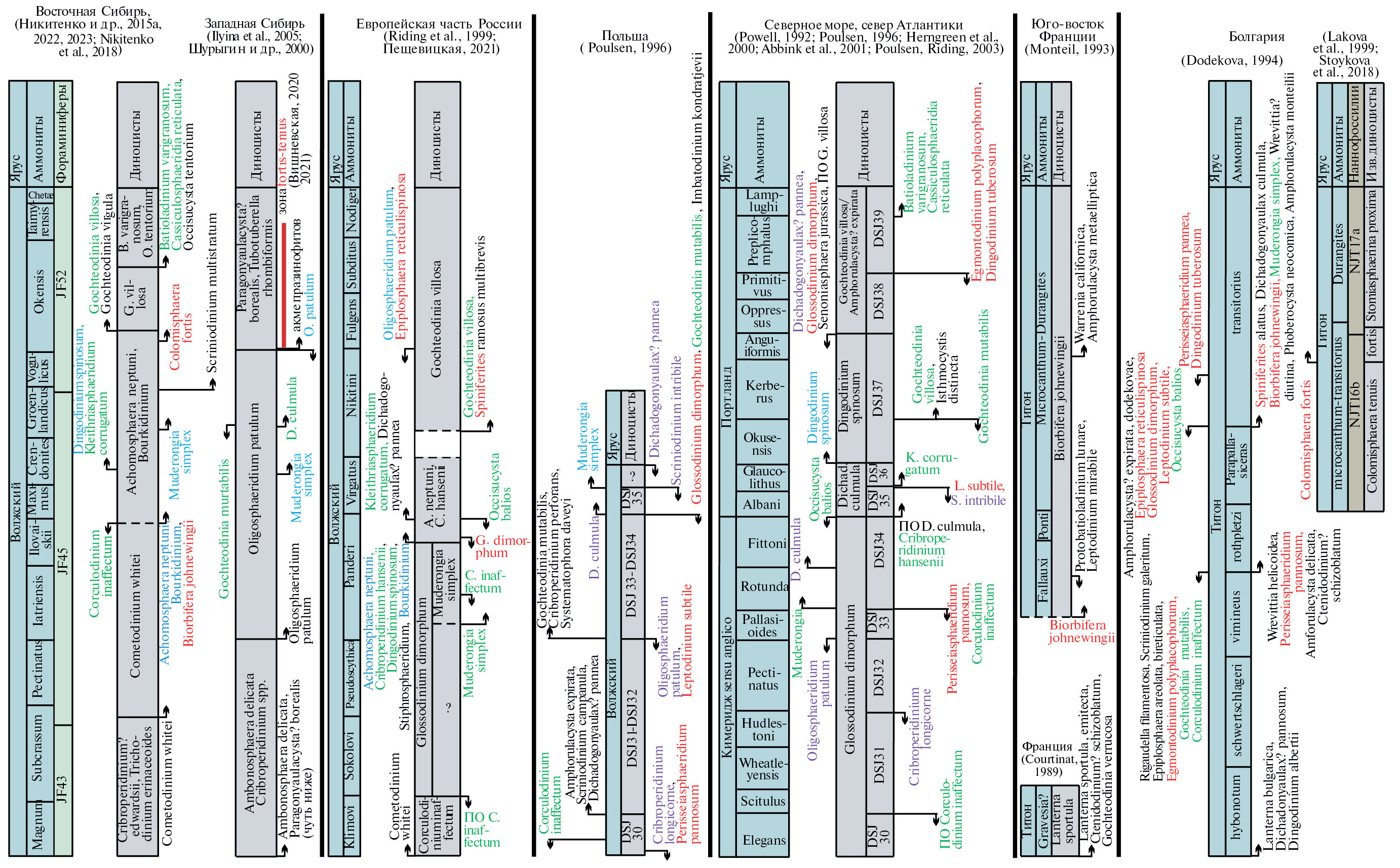 Обедненный комплекс диноцист с Paragonyaulacysta? borealis (Brid. et Fish.) Stov. et Ev., Tubotuberella rhombiformis Vozz. и обилие празинофитов были выявлены в верхней части волжского яруса на севере Восточной Сибири в разрезе Нордвик (Шурыгин и др., 2000). В дальнейшем эта часть разреза была доизучена и расчленена более детально на основе признаков, имеющих местное значение (Nikitenko et al., 2008). Последующее изучение этого разреза, а также разрезов Анабар и Оленек позволило установить последовательность слоев с диноцистами с верхнего бата по готерив (Никитенко и др., 2015а, 2015б, 2022, 2023; Nikitenko et al., 2018). Расчленение волжского яруса было пересмотрено. Для обоснования границ биостратонов были выбраны виды, прослеживающиеся в одновозрастных отложениях на севере Сибири, и коррелятивные таксоны, которые появляются/исчезают на близких стратиграфических рубежах на территории Восточной и Западной Европы (рис. 6). Интересно отметить в средней части волжского яруса (разрез Нордвик) присутствие редких Biorbifera johnewingii Hab., характерного таксона для верхней части титона в тетических районах. В верхней части яруса выявлен уровень с кальциферами/известковыми диноцистами Colomisphaera fortis Reh., который по стратиграфическому положению близок с одноименной тетической зоной. Находки известковых диноцист Colomisphaera fortis, C. tenuis, Stomiosphaerina proxima, которые являются индексами зон тетических шкал, известны также из Западной Сибири (Vishnevskaya, 2017; Vishnevskaya et al., 2019; Вишневская, 2020).