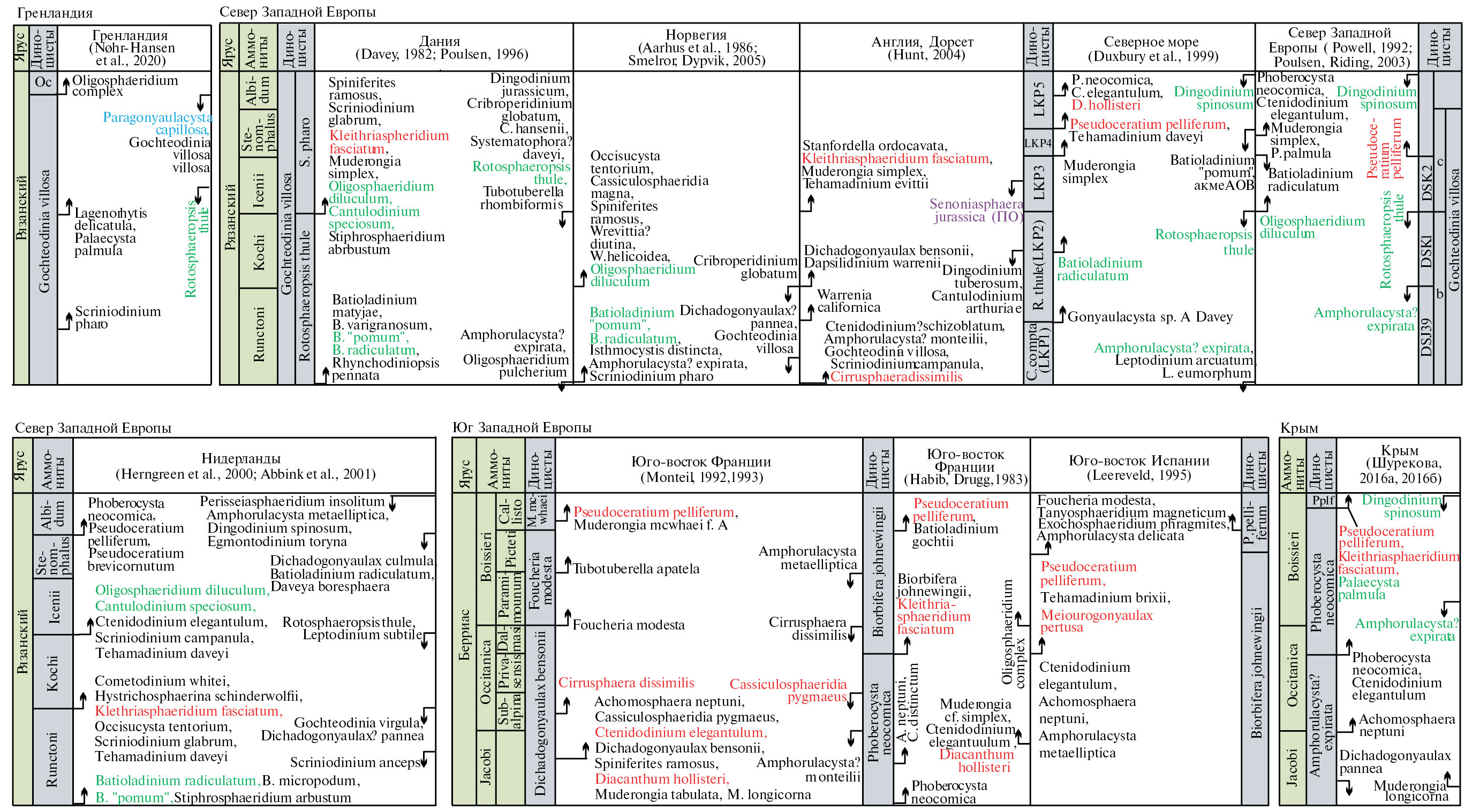 На Шпицбергене в рязанском ярусе определены бедные комплексы диноцист, представленные таксонами широкого стратиграфического диапазона (Dalseg et al., 2016; Rakocinski et al., 2018; Koevoets et al., 2018a). Таксономический состав имеет много общих черт с волжскими комплексами диноцист. Характерно доминирование Sirmiodinium grossii Alb., Tubotuberella apatela (Cook. et Eis.) Ioan., Escharisphaeridia rudis Dav., Valensiella cf. ovulum (Def.) Eis. Обедненный состав диноцистовых комплексов также характерен для рязанского яруса Гренландии (Hakansson et al., 1981; Nøhr-Hansen et al., 2020). Однако некоторые ключевые биособытия прослеживаются на севере Западной Европы и в Сибири (рис. 7, 8).
