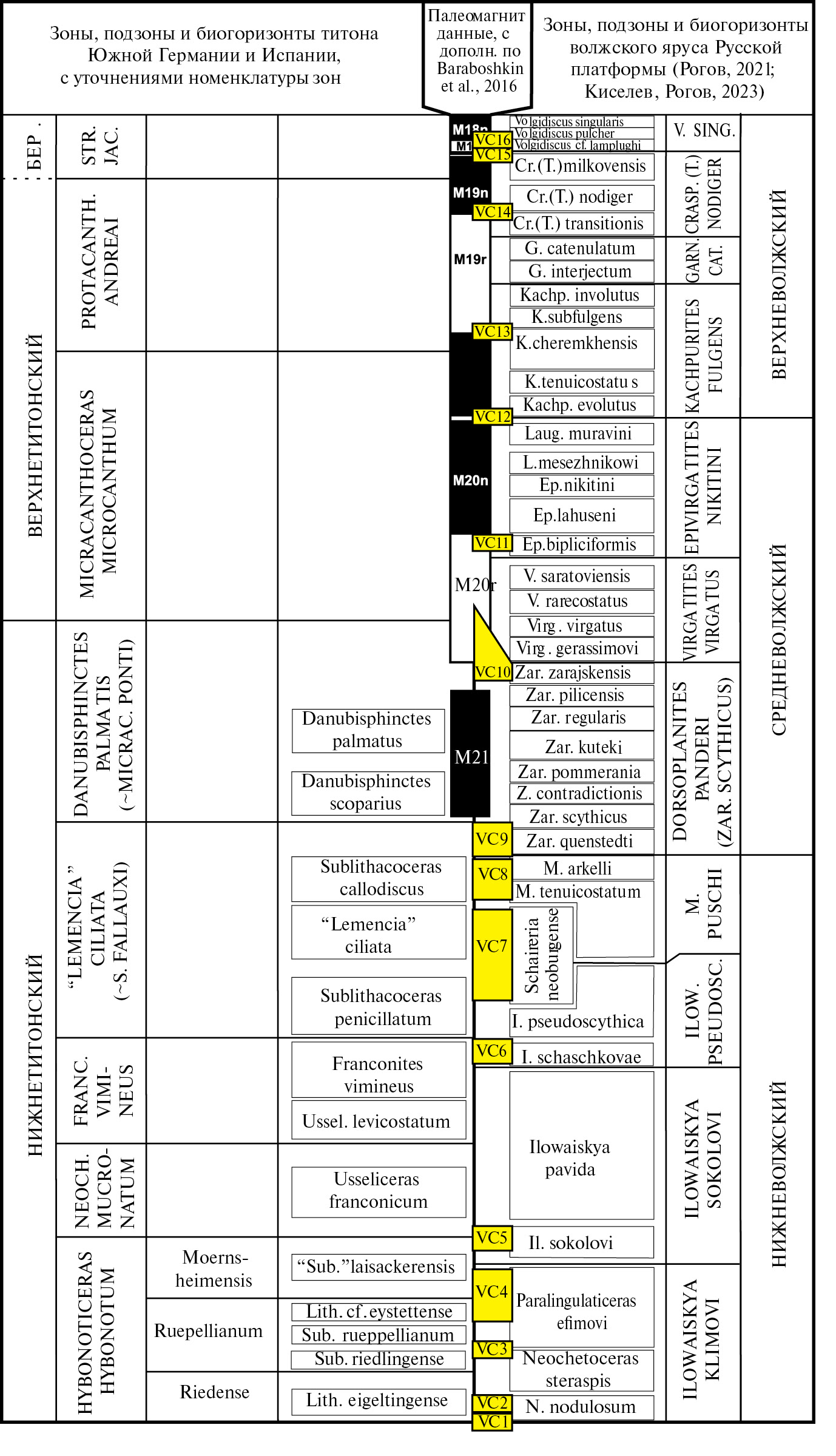 Рис. 2. Зональное и инфразональное расчленение волжского яруса по аммонитам (по Рогов, 2021; Киселев, Рогов, 2023).