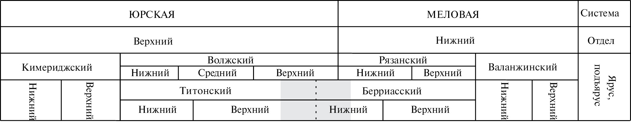 Своеобразие морских фаун конца юры и начала мела и высокая степень биогеографической дифференциации моллюсков, по которым осуществлялись расчленение и корреляция отложений, привели к тому, что еще в XIX в. в качестве верхнего яруса юрской системы для разных регионов было предложено три яруса – портландский (d’Orbigny, 1842–1850, типовая местность – Северо-Западная Франция и Англия), титонский (Oppel, 1865, типовая местность не указана, ярус предложен для Южной Европы) и волжский (Никитин, 1881, типовая местность – Верхнее Поволжье, сейчас – Ярославская область). При этом специфика фаун терминальной юры европейской части России была установлена еще раньше, когда К.Ф. Рулье (Рулье, 1845; Rouillier, Frears, 1845) для окрестностей Москвы предложил выделять “ярус с Ammonites virgatus” и “ярус с Ammonites catenulatus”, отвечающие средне- и верхневолжскому подъярусам в современном понимании. В 1884 г. С.Н. Никитин разделил единый волжский ярус на нижний и верхний волжский (или нижневолжский и верхневолжский) ярусы, но в течение некоторого времени в одних и тех же публикациях использовал одновременно все эти подразделения (Никитин, 1884, 1885, 1888) – волжский, нижний волжский и верхний волжский ярусы. Сначала С.Н. Никитин полагал, что волжский ярус завершает юрскую систему. Позднее, во многом из-за ошибочного сопоставления рязанского горизонта с волжскими отложениями, он стал считать волжские ярусы пограничными между юрой и мелом, обозначив их JCra и JCrb (Никитин, 1887, 1888). В противоположность С.Н. Никитину, который отмечал, что волжский ярус сложно сопоставить с западноевропейскими стратиграфическими подразделениями, его современник и оппонент по многим вопросам А.П. Павлов отстаивал точку зрения, согласно которой в европейской части России можно проследить ярусы, установленные ранее в Англии, – кимеридж и перекрывающий его портланд. Для “верхнего портланда”, примерно эквивалентного верхневолжскому ярусу С.Н. Никитина (в его расширенном понимании, вместе с рязанским горизонтом), А.П. Павлов предложил выделять аквилонский ярус (или подъярус). Сначала к аквилонскому подъярусу был отнесен интервал от верхневолжского подъяруса до низов валанжина (Pavlow, Lamplugh, 1892). В дальнейшем Павлов рассматривал аквилон как ярус, эквивалентный верхнему титону и пурбеку, и оставил там только аналоги верхневолжского подъяруса и низов рязанского яруса в современном понимании (Павлов, 1895; Pavlow, 1896). В конце XIX и первой половине ХХ вв. волжские ярусы, портланд и аквилон употреблялись для бореальных отложений примерно в равной частоте.