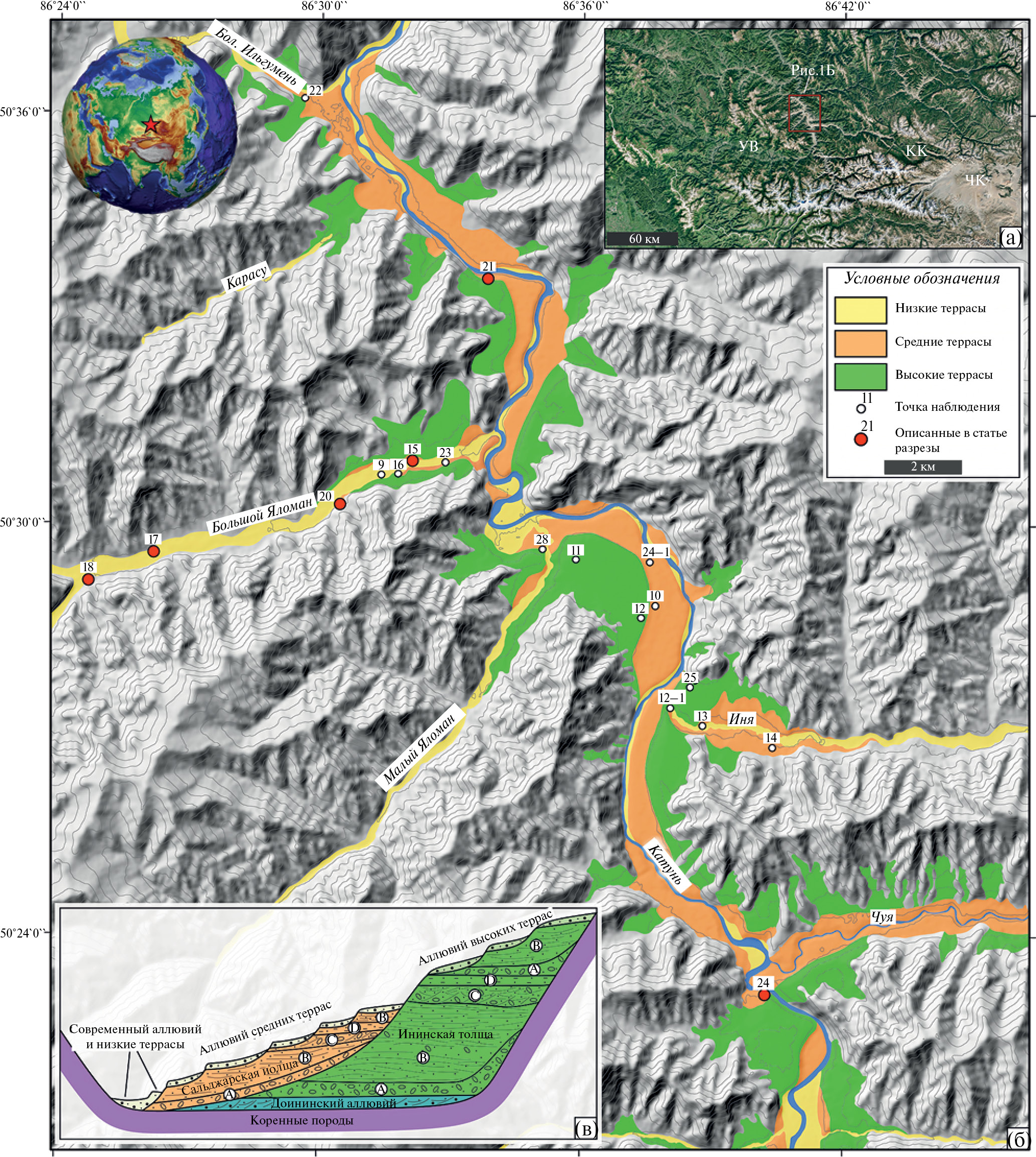 Яломанская впадина представляет собой субмеридионально вытянутый участок долины р. Катунь протяженностью 43 км и шириной до 3 км, ограниченный по бортам долины сбросовыми разломами (Деев и др., 2015). При этом серия оперяющих разломов дренируется правыми и левыми притоками р. Катунь (рр. Чуя, Большой и Малый Яломан, Иня и др.). Впадина заполнена мощным комплексом (250–300 м) плейстоцен-голоценовых отложений, главным образом слагающих три основные высотные серии террас. К ним относятся высокие (до 230 м над уровнем рек), средние (80–100 м) и низкие террасы (до 10 м) (рис. 1б, 1в). Комплексы высоких и средних террас сложены в целом фациально схожими отложениями ининской и сальджарской толщ (рис. 1в), генезис и возраст которых до сих пор являются предметом неразрешимой дискуссии. Отложения ининской толщи, слагающие комплексы высоких террас, представлены чередованием пачек преимущественно темно-серых параллельно-слоистых пескодресвяников со слоями и линзами темно-серых неравномерно окатанных галечников и слоями валунно-глыбовников (Бутенко, 2001; Зольников, Мистрюков, 2008). Комплекс средних террас выполнен чередованием галечников, валунно-глыбовников, песков и алевритов сальджарской толщи (Бутенко, 2001). Низкие же террасы сложены молодым аллювием, врезанным в средние террасы.